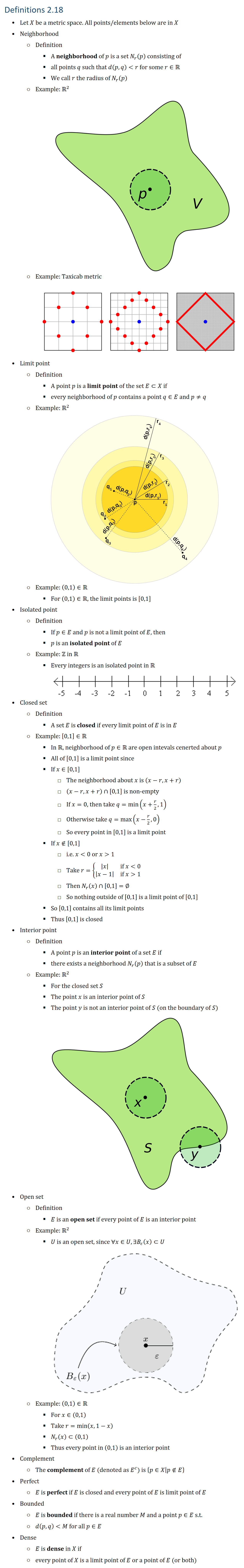 Definitions 2.18 • Let X be a metric space. All points/elements below are in X • Neighborhood ○ Definition § A neighborhood of p is a set N_r (p) § consisting of all points q such that d(p,q)r for some r∈R § r is the radius of N_r (p) ○ Example: R2 ○ Example: Taxicab metric • Limit point ○ Definition § A point p is a limit point of the set E⊂X if § every neighborhood of p contains a point q∈E and p≠q ○ Example: R2 ○ Example: (0,1)∈R § For (0,1)∈R, the limit points is [0,1] • Isolated point ○ Definition § If p∈E and p is not a limit point of E § then p is an isolated point of E ○ Example: Z in R § Every integers is an isolated point in R • Closed set ○ Definition § A set E is closed if every limit point of E is in E ○ Example: [0,1]∈R § In R, neighborhood of p∈R are open intevals cenerted about p § All of [0,1] is a limit point since § If x∈[0,1] □ The neighborhood about x is (x−r,x+r) □ (x−r,x+r)∩[0,1] is non-empty □ If x=0, then take q=min(x+r/2,1) □ Otherwise take q=max(x−r/2,0) □ So every point in [0,1] is a limit point § If x∉[0,1] □ i.e. x0 or x1 □ Take r={■8(|x|&if x0@|x−1|&if x1)┤ □ Then N_r (x)∩[0,1]=∅ □ So nothing outside of [0,1] is a limit point of [0,1] § So [0,1] contains all its limit points § Thus [0,1] is closed • Interior point ○ Definition § A point p is an interior point of a set E if § there exists a neighborhood N_r (p) that is a subset of E ○ Example: R2 § For the closed set S § The point x is an interior point of S § The point y is not an interior point of S (on the boundary of S) • Open set ○ Definition § E is an open set if every point of E is an interior point ○ Example: R2 § U is an open set, since ∀x∈U, ∃B_ϵ (x)⊂U ○ Example: (0,1)∈R § For x∈(0,1) § Take r=min(x,1−x) § N_r (x)⊂(0,1) § Thus every point in (0,1) is an interior point • Complement ○ Definition § The complement of E (denoted E^c) is {p∈X│p∉E} • Perfect ○ Definition § E is perfect if E is closed and every point of E is limit point of E • Bounded ○ Definition § E is bounded if there is a real number M and a point p∈E s.t. § d(p,q)M for all p∈E • Dense ○ Definition § E us dense in X if every point of X § is a limit point of E or a point of E (or both)