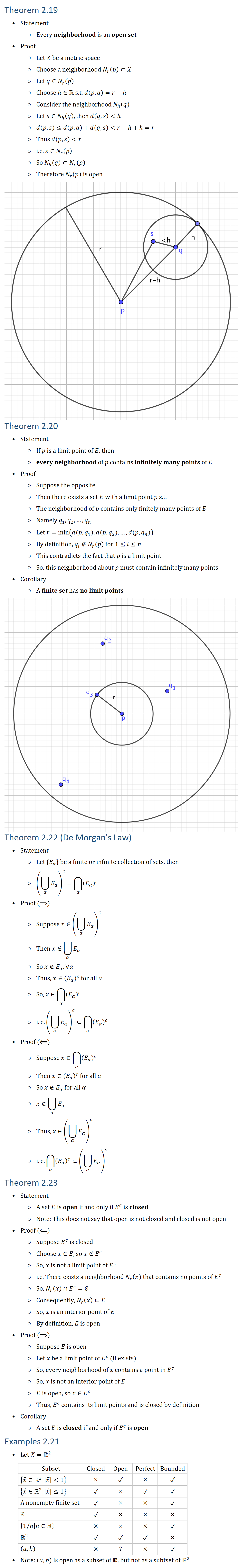 Theorem 2.19 • Statement ○ Every neighborhood is an open set • Proof ○ Let X be a metric space ○ Choose neighborhood N_r (p)=E∈X ○ Let q∈E ○ Choose h s.t. d(p,q)=r−h ○ Consider N_h(q) ○ So, if s∈N_h(q), d(q,s)h ○ d(p,s)≤d(p,q)+d(q,s)r−h+h=r ○ Thus d(p,s)r ○ i.e. s∈N_r (p) ○ So N_h(q)⊂N_r (p) ○ Therefore N_r (p) is open Theorem 2.20 • Statement ○ If p is a limit point of E, then ○ every neighborhood of p contains infinitely many points of E • Proof ○ Suppose the opposite ○ Then there exists a set E with a limit point p s.t. ○ The neighborhood of p contains only finitly many points of E ○ Namely q_1,q_2,…,q_n ○ Let r=min(d(p,q_1 ),d(p,q_2 ),…,d(p,q_n )) ○ By definition, q_i∉N_r (p) for 1≤i≤n ○ This contradicts the fact that p is a limit point ○ So, this neighborhood about p must contain infinitely many points • Corollary ○ A finite set has no limit points Theorem 2.22 (De Morgan s Law) • Statement ○ Let {E_x } be a finite or infinite collection of sets, then ○ (⋃8_α▒E_α )^c=⋂8_α▒(E_α )^c • Proof ○ Suppose x∈(⋃8_α▒E_α )^c § Then x∉⋃8_α▒E_α § So x∉E_α for all α § Thus, x∈(E_α )^c for all α § So, x∈⋂8_α▒(E_α )^c § Therefore (⋃8_α▒E_α )^c⊂⋂8_α▒(E_α )^c ○ Suppose x∈⋂8_α▒(E_α )^c § Then x∈(E_α )^c for all α § So x∉E_α for all α § x∉⋃8_α▒E_α § Thus, x∈(⋃8_α▒E_α )^c § So ⋂8_α▒(E_α )^c ⊂(⋃8_α▒E_α )^c ○ Therefore (⋃8_α▒E_α )^c=⋂8_α▒(E_α )^c Theorem 2.23 • Statement ○ A set E is open if and only if E^c is closed ○ Note: This does not say that open is not closed and closed is not open • Proof ○ Suppose E^c is closed § Choose x∈E, so x∉E^c § So, x is not a limit point of E^c § So, there exists a neighborhood N_r (x) that contains no points of E^c § So, N_r (x)∩E^c=∅ § Consequently, N_r (x)⊂E § So, x is an interior point of E § By definition, E is open ○ Suppose E is open § Let x be a limit point of E^c (if exists) § So, every neighborhood of x contains a point in E^c § So, x is not an interior point of E § E is open, so x∈E^c § Thus, E^c contains its limit points and is closed by definition • Corollary ○ A set E is closed if and only if E^c is open Examples 2.21 • Let X=R2 Subset Closed Open Perfect Bounded {x ⃗∈R2│|x ⃗ |1} × ✓ × ✓ {x ⃗∈R2│|x ⃗ |≤1} ✓ × ✓ ✓ A nonempty finite set ✓ × × ✓ Z ✓ × × × {1/n│n∈N × × × ✓ R2 ✓ ✓ ✓ × (a,b) × ? × ✓ • Note: (a,b) is open as a subset of R, but not as a subtset of R2
