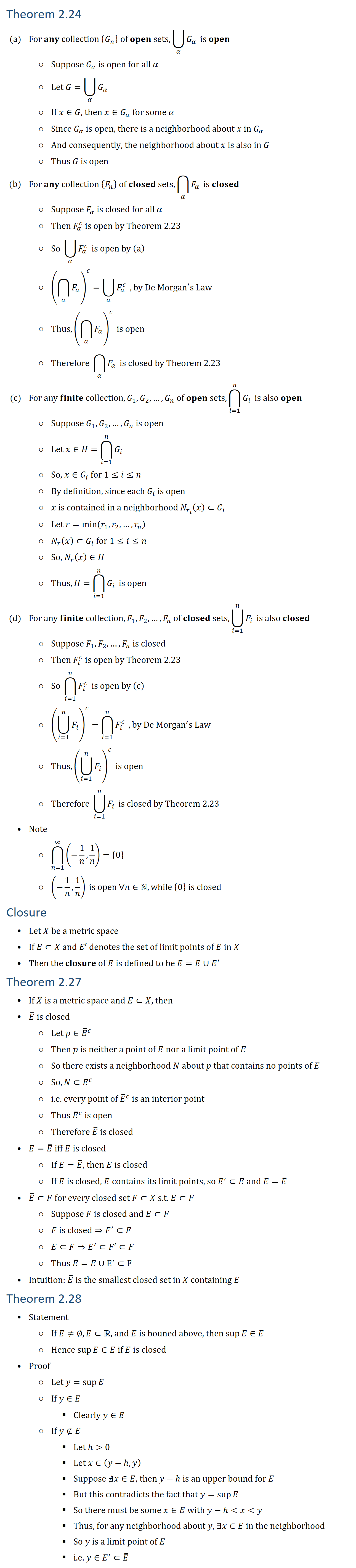 Theorem 2.24 (a) For any collection {G_n } of open sets, ⋃8_α▒G_α is open ○ Suppose G_α is open for all α ○ Let G=⋃8_α▒G_α ○ If x∈G, then x∈G_α for some α ○ Since G_α is open, there is a neighborhood about x in G_α ○ And consequently, the neighborhood about x is also in G ○ Thus G is open (b) For any collection {F_n } of closed sets, ⋂8_α▒F_α is closed ○ Suppose F_α is closed for all α ○ Then F_α^c is open by Theorem 2.23 ○ So ⋃8_α▒F_α^c is open by (a) ○ (⋂8_α▒F_α )c=⋃8_α▒F_αc , by De Morgan^′ s Law ○ Thus, (⋂8_α▒F_α )^c is open ○ Therefore ⋂8_α▒F_α is closed by Theorem 2.23 (c) For any finite collection, G_1,G_2,…,G_n of open sets, ⋂8_(i=1)^n▒G_i is also open ○ Suppose G_1,G_2,…,G_n is open ○ Let x∈H=⋂8_(i=1)^n▒G_i ○ So, x∈G_i for 1≤i≤n ○ By definition, since each G_i is open ○ x is contained in a neighborhood N_(r_i ) (x)⊂G_i ○ Let r=min(r_1,r_2,…,r_n ) ○ N_r (x)⊂G_i for 1≤i≤n ○ So, N_r (x)∈H ○ Thus, H=⋂8_(i=1)^n▒G_i is open (d) For any finite collection, F_1,F_2,…,F_n of closed sets, ⋃24_(i=1)^n▒F_i is also closed ○ Suppose F_1,F_2,…,F_n is closed ○ Then F_i^c is open by Theorem 2.23 ○ So ⋂24_(i=1)n▒F_ic is open by (c) ○ (⋃24_(i=1)^n▒F_i )c=⋂24_(i=1)n▒F_i^c , by De Morgan^′ s Law ○ Thus, (⋃24_(i=1)^n▒F_i )^c is open ○ Therefore ⋃24_(i=1)^n▒F_i is closed by Theorem 2.23 • Note ○ ⋂24_(n=1)^∞▒(−1/n,1/n) ={0} ○ (−1/n,1/n) is open ∀n∈N, while {0} is closed Closure • Let X be a metric space • If E⊂X and E′ denotes the set of limit points of E in X • Then the closure of E is defined to be E ̅=E∪E^′ Theorem 2.27 • If X is a metric space and E⊂X, then • E ̅ is closed ○ Let p∈E ̅^c ○ Then p is neither a point of E nor a limit point of E ○ So there exists a neighborhood N about p that contains no points of E ○ So,N⊂E ̅^c ○ i.e. every point of E ̅^c is an interior point ○ Thus E ̅^c is open ○ Therefore E ̅ is closed • E=E ̅ iff E is closed ○ If E=E ̅, then E is closed ○ If E is closed, E contains its limit points, so E^′⊂E and E=E ̅ • E ̅⊂F for every closed set F⊂X s.t. E⊂F ○ Suppose F is closed and E⊂F ○ F is closed⇒F^′⊂F ○ E⊂F⇒E^′⊂F′⊂F ○ Thus E ̅=E∪E^′⊂F • Intuition: E ̅ is the smallest closed set in X containing E Theorem 2.28 • Statement ○ If E≠∅, E⊂R, and E is bouned above, then supE∈E ̅ ○ Hence supE∈E if E is closed • Proof ○ Let y=supE ○ If y∈E § Clearly y∈E ̅ ○ If y∉E § Let h 0 § Let x∈(y−hy) § Suppose ∄x∈E, then y−h is an upper bound for E § But this contradicts the fact that y=supE § So there must be some x∈E with y−h x y § Thus, for any neighborhood about y, ∃x∈E in the neighborhood § So y is a limit point of E § i.e. y∈E^′⊂E ̅