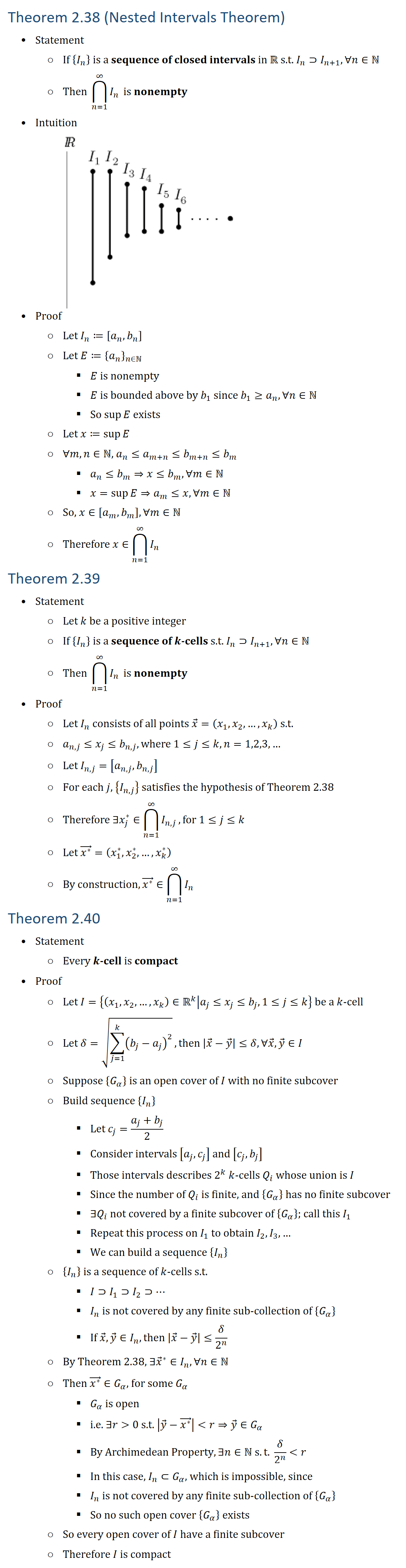 Theorem 2.38 (Nested Intervals Theorem) • Statement ○ If {I_n } is a sequence of closed intervals in R s.t. I_n⊃I_(n+1),∀n∈N ○ Then ⋂24_(n=1)^∞▒I_n is nonempty • Intuition • Proof ○ Let I_n≔[a_n,b_n ] ○ Let E≔{a_n }_(n∈N § E is nonempty § E is bounded above by b_1 since b_1≥a_n,∀n∈N § So supE exists ○ Let x≔supE ○ For m,n∈N, a_n≤a_(m+n)≤b_(m+n)≤b_m § a_n≤b_m⇒x≤b_n,∀m∈N § x=supE⇒a_m≤x,∀m∈N ○ So, x∈[a_m,b_m ],∀m∈N ○ Therefore x∈⋂24_(n=1)^∞▒I_n Theorem 2.39 • Statement ○ Let k be a positive integer ○ If {I_n } is a sequence of k-cells s.t. I_n⊃I_(n+1),∀n∈N ○ Then ⋂24_(n=1)^∞▒I_n is nonempty • Proof ○ Let I_n consists of all points x ⃗=(x_1,x_2,…,x_k ) s.t. ○ a_(n,j)≤x_j≤b_(n,j), where 1≤j≤k,n=1,2,3,… ○ Let I_(n,j)=[a_(n,j),b_(n,j) ] ○ For each j, {I_(n,j) } satisfies the hypothesis of Theorem 2.38 ○ Therefore ∃x_j∗∈⋂24_(n=1)∞▒I_(n,j) , for 1≤j≤k ○ Let (x^∗ ) ⃗=(x_1∗,x_2∗,…,x_k^∗ ) ○ By construction, (x^∗ ) ⃗∈⋂24_(n=1)^∞▒I_n Theorem 2.40 • Statement ○ Every k-cell is compact • Proof ○ Let I={(x_1,x_2,…,x_k )∈Rk│a_j≤x_j≤b_j,1≤j≤k} be a k-cell ○ Let δ=√(∑_(j=1)^k▒(b_j−a_j )^2 ), then |x ⃗−y ⃗ |≤δ,∀x ⃗,y ⃗∈I ○ Suppose {G_α } is an open cover of I with no finite subcover ○ Build sequence {I_n } § Let c_j=(a_j+b_j)/2 § Consider intervals [a_j,c_j ] and [c_j,b_j ] § Those intervals describes 2^k k-cells Q_i whose union is I § Since the number of Q_i is finite, and {G_α } has no finite subcover § ∃Q_i not covered by a finite subcover of {G_α }; call this I_1 § Repeat this process on I_1 to obtain I_2,I_3,… § We can build a sequence {I_n } ○ {I_n } is a sequence of k-cells s.t. § I⊃I_1⊃I_2⊃… § I_n is not covered by any finite sub-collection of {G_α } § If x ⃗,y ⃗∈I_n, then |x ⃗−y ⃗ |≤δ/2^n ○ By Theorem 2.38, ∃x ⃗^∗∈I_n,∀n∈N ○ Then (x^∗ ) ⃗∈G_α, for some G_α § G_α is open § i.e. ∃r 0 s.t. |y ⃗−(x^∗ ) ⃗ | r⇒y ⃗∈G_α § By Archimedean Property, ∃n∈N s.t. δ/2^n r § In this case, I_n⊂G_α, which is impossible, since § I_n is not covered by any finite sub-collection of {G_α } § So no such open cover {G_α } exists ○ So every open cover of I have a finite subcover ○ Therefore I is compact