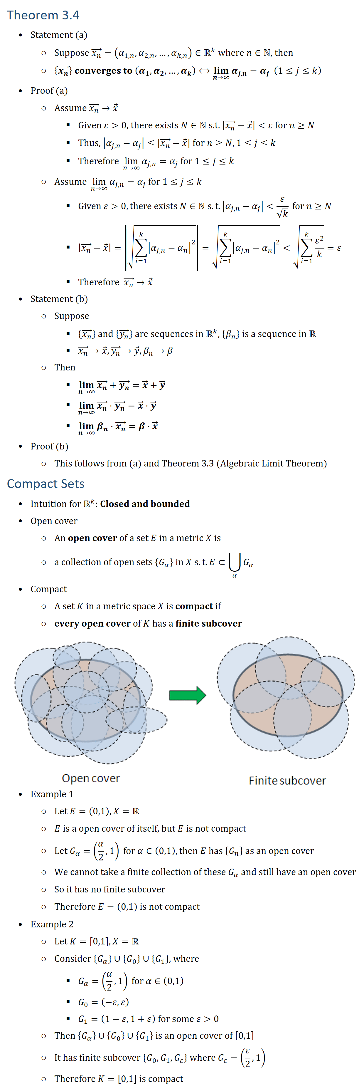 Theorem 3.4 • Statement (a) ○ Suppose (x_n ) ⃗=(α_(1,n),α_(2,n),…,α_(k,n) )∈Rk where n∈N, then ○ {(x_n ) ⃗ } converges to (α_1,α_2,…,α_k )⟺(lim)_(n→∞)〖α_(j,n) 〗=α_j (1≤j≤k) • Proof (a) ○ Assume (x_n ) ⃗→x ⃗ § Given ε 0, there exists N∈N s.t. |(x_n ) ⃗−x ⃗ | ε for n≥N § Thus, |α_(j,n)−α_j |≤|(x_n ) ⃗−x ⃗ | for n≥N,1≤j≤k § Therefore lim_(n→∞)〖α_(j,n) 〗=α_j for 1≤j≤k ○ Assume lim_(n→∞)〖α_(j,n) 〗=α_j for 1≤j≤k § Given ε 0, there exists N∈N s.t. |α_(j,n)−α_j | ε/√k for n≥N § |(x_n ) ⃗−x ⃗ |=|√(∑_(i=1)^k▒|α_(j,n)−α_n |^2 )|=√(∑_(i=1)^k▒|α_(j,n)−α_n |^2 ) √(∑_(i=1)k▒ε2/k)=ε § Therefore (x_n ) ⃗→x ⃗ • Statement (b) ○ Suppose § {(x_n ) ⃗ } and {(y_n ) ⃗ } are sequences in Rk, {β_n } is a sequence in R § (x_n ) ⃗→x ⃗, (y_n ) ⃗→y ⃗, β_n→β ○ Then § (lim)_(n→∞)〖(x_n ) ⃗+(y_n ) ⃗ 〗=x ⃗+y ⃗ § (lim)_(n→∞)〖(x_n ) ⃗⋅(y_n ) ⃗ 〗=x ⃗⋅y ⃗ § (lim)_(n→∞)〖β_n⋅(x_n ) ⃗ 〗=β⋅x ⃗ • Proof (b) ○ This follows from (a) and Theorem 3.3 (Algebraic Limit Theorem) Compact Sets • Intuition for Rk: Closed and bounded • Open cover ○ An open cover of a set E in a metric X is ○ a collection of open sets {G_α } in X s.t. E⊂⋃8_α▒G_α • Compact ○ A set K in a metric space X is compact if ○ every open cover of K has a finite subcover • Example 1 ○ Let E=(0,1), X=R ○ E is a open cover of itself, but E is not compact ○ Let G_α=(α/2,1) for α∈(0,1), then E has {G_n } as an open cover ○ We cannot take a finite collection of these G_α and still have an open cover ○ So it has no finite subcover ○ Therefore E=(0,1) is not compact • Example 2 ○ Let K=[0,1], X=R ○ Consider {G_α }∪{G_0 }∪{G_1 }, where § G_α=(α/2,1) for α∈(0,1) § G_0=(−ε,ε) § G_1=(1−ε,1+ε) for some ε 0 ○ Then {G_α }∪{G_0 }∪{G_1 } is an open cover of [0,1] ○ It has finite subcover {G_0,G_1,G_ε } where G_ε=(ε/2,1) ○ Therefore K=[0,1] is compact