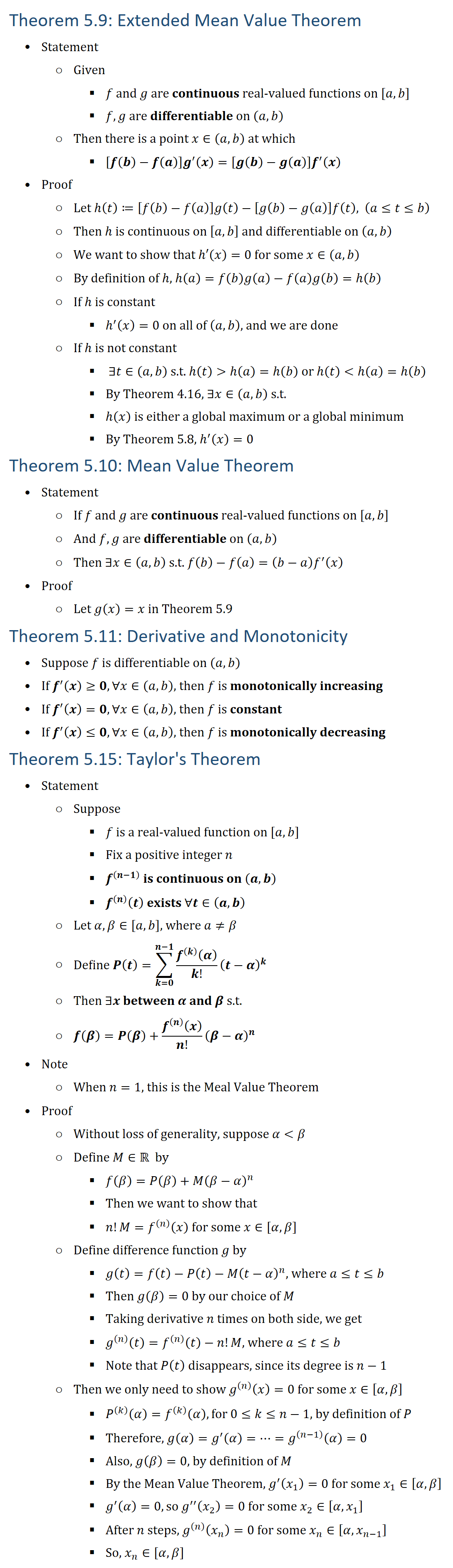 Theorem 5.9: Extended Mean Value Theorem • Statement ○ Given § f and g are continuous real-valued functions on [a,b] § f,g are differentiable on (a,b) ○ Then there is a point x∈(a,b) at which § [f(b)−f(a)] g^′ (x)=[g(b)−g(a)] f^′ (x) • Proof ○ Let h(t)≔[f(b)−f(a)]g(t)−[g(b)−g(a)]f(t), (a≤t≤b) ○ Then h is continuous on [a,b] and differentiable on (a,b) ○ We want to show that h′(x)=0 for some x∈(a,b) ○ By definition of h, h(a)=f(b)g(a)−f(a)g(b)=h(b) ○ If h is constant § h′ (x)=0 on all of (a,b), and we are done ○ If h is not constant § ∃t∈(a,b) s.t. h(t) h(a)=h(b) or h(t) h(a)=h(b) § By Theorem 4.16, ∃x∈(a,b) s.t. § h(x) is either a global maximum or a global minimum § By Theorem 5.8, h′ (x)=0 Theorem 5.10: Mean Value Theorem • Statement ○ If f and g are continuous real-valued functions on [a,b] ○ And f,g are differentiable on (a,b) ○ Then ∃x∈(a,b) s.t. f(b)−f(a)=(b−a) f^′ (x) • Proof ○ Let g(x)=x in Theorem 5.9 Theorem 5.11: Derivative and Monotonicity • Suppose f is differentiable on (a,b) • If f^′ (x)≥0,∀x∈(a,b), then f is monotonically increasing • If f^′ (x)=0,∀x∈(a,b), then f is constant • If f^′ (x)≤0,∀x∈(a,b), then f is monotonically decreasing Theorem 5.15: Taylor s Theorem • Statement ○ Suppose § f is a real-valued function on [a,b] § Fix a positive integer n § f^((n−1) ) is continuous on (a,b) § f^((n) ) (t) exists ∀t∈(a,b) ○ Let α,β∈[a,b], where a≠β ○ Define P(t)=∑_(k=0)(n−1)▒〖(f((k) ) (α))/k! (t−α)^k 〗 ○ Then ∃x between α and β s.t. ○ f(β)=P(β)+(f^((n) ) (x))/n! (β−α)^n • Note ○ When n=1, this is the Meal Value Theorem • Proof ○ Without loss of generality, suppose α β ○ Define M∈R by § f(β)=P(β)+M(β−α)^n § Then we want to show that § n!M=f^((n) ) (x) for some x∈[α,β] ○ Define difference function g by § g(t)=f(t)−P(t)−M(t−α)^n, where a≤t≤b § Then g(β)=0 by our choice of M § Taking derivative n times on both side, we get § g^((n) ) (t)=f^((n) ) (t)−n!M, where a≤t≤b § Note that P(t) disappears, since its degree is n−1 ○ Then we only need to show g^((n) ) (x)=0 for some x∈[α,β] § P^((k) ) (α)=f^((k) ) (α),for 0≤k≤n−1, by definition of P § Therefore, g(α)=g^′ (α)=…=g^((n−1) ) (α)=0 § Also, g(β)=0, by definition of M § By the Mean Value Theorem, g^′ (x_1 )=0 for some x_1∈[α,β] § g^′ (α)=0, so g^′′ (x_2 )=0 for some x_2∈[α,x_1 ] § After n steps, g^((n) ) (x_n )=0 for some x_n∈[α,x_(n−1) ] § So, x_n∈[α,β]