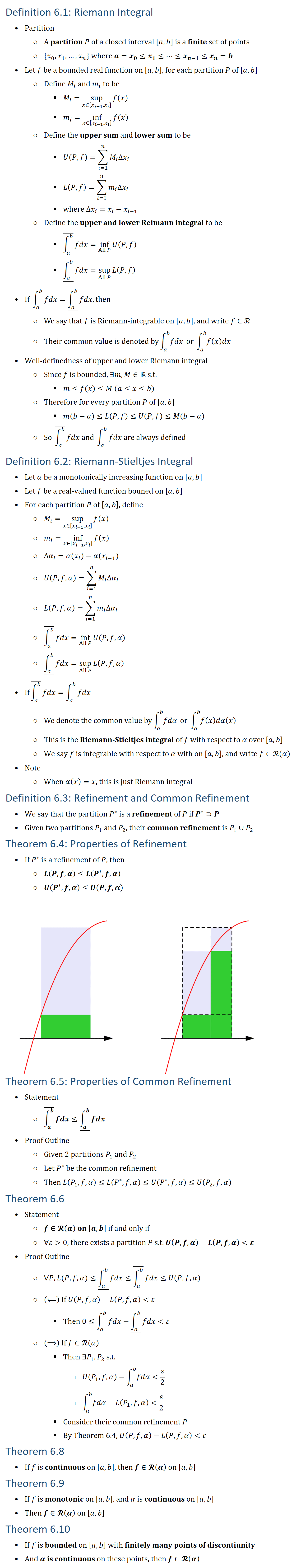 Definition 6.1: Riemann Integral • Partition ○ A partition P of a closed interval [a,b] is a finite set of points ○ {x_0,x_1,…,x_n } where a=x_0≤x_1≤…≤x_(n−1)≤x_n=b • Let f be a bounded real function on [a,b], for each partition P of [a,b] ○ Define M_i and m_i to be § M_i=sup┬(x∈[x_(i−1),x_i ] )f(x) § m_i=inf┬(x∈[x_(i−1),x_i ] )f(x) ○ Define the upper sum and lower sum to be § U(P,f)=∑_(i=1)^n▒〖M_i Δx_i 〗 § L(P,f)=∑_(i=1)^n▒〖m_i Δx_i 〗 § where Δx_i=x_i−x_(i−1) ○ Define the upper and lower Reimann integral to be § (∫_a^b▒ ) ̅fdx=inf┬(All P)U(P,f) § ▁(∫_a^b▒ ) fdx=sup┬(All P)L(P,f) • If (∫_a^b▒ ) ̅fdx=▁(∫_a^b▒ ) fdx, then ○ We say that f is Riemann\integrable on [a,b], and write f∈R ○ Their common value is denoted by∫_a^b▒fdx or ∫_a^b▒f(x)dx • Well-definedness of upper and lower Riemann integral ○ Since f is bounded, ∃m,M∈R s.t. § m≤f(x)≤M (a≤x≤b) ○ Therefore for every partition P of [a,b] § m(b−a)≤L(P,f)≤U(P,f)≤M(b−a) ○ So (∫_a^b▒ ) ̅fdx and ▁(∫_a^b▒ ) fdx are always defined Definition 6.2: Riemann-Stieltjes Integral • Let α be a monotonically increasing function on [a,b] • Let f be a real-valued function bouned on [a,b] • For each partition P of [a,b], define ○ M_i=sup┬(x∈[x_(i−1),x_i ] )f(x) ○ m_i=inf┬(x∈[x_(i−1),x_i ] )f(x) ○ Δα_i=α(x_i )−α(x_(i−1) ) ○ U(P,f,α)=∑_(i=1)^n▒〖M_i Δα_i 〗 ○ L(P,f,α)=∑_(i=1)^n▒〖m_i Δα_i 〗 ○ (∫_a^b▒ ) ̅fdx=inf┬(All P)U(P,f,α) ○ ▁(∫_a^b▒ ) fdx=sup┬(All P)L(P,f,α) • If(∫_a^b▒ ) ̅fdx=▁(∫_a^b▒ ) fdx ○ We denote the common value by∫_a^b▒fdα or ∫_a^b▒f(x)dα(x) ○ This is the Riemann-Stieltjes integral of f with respect to α over [a,b] ○ We say f is integrable with respect to α with on [a,b], and write f∈R(α) • Note ○ When α(x)=x, this is just Riemann integral Definition 6.3: Refinement and Common Refinement • We say that the partition P^∗ is a refinement of P if P^∗⊃P • Given two partitions P_1 and P_2, their common refinement is P_1∪P_2 Theorem 6.4: Properties of Refinement • If P^∗ is a refinement of P, then ○ L(P,f,α)≤L(P^∗,f,α) ○ U(P^∗,f,α)≤U(P,f,α) Theorem 6.5: Properties of Common Refinement • Statement ○ (∫_a^b▒ ) ̅fdx≤▁(∫_a^b▒ ) fdx • Proof Outline ○ Given 2 partitions P_1 and P_2 ○ Let P^∗ be the common refinement ○ Then L(P_1,f,α)≤L(P∗,f,α)≤U(P∗,f,α)≤U(P_2,f,α) Theorem 6.6 • Statement ○ f∈R(α) on [a,b] if and only if ○ ∀ε 0, there exists a partition P s.t. U(P,f,α)−L(P,f,α) ε • Proof Outline ○ ∀P,L(P,f,α)≤▁(∫_a^b▒ ) fdx≤(∫_a^b▒ ) ̅fdx≤U(P,f,α) ○ (⟸) If U(P,f,α)−L(P,f,α) ε § Then 0≤(∫_a^b▒ ) ̅fdx−▁(∫_a^b▒ ) fdx ε ○ (⟹) If f∈R(α) § Then ∃P_1,P_2 s.t. □ U(P_1,f,α)−∫_a^b▒fdα ε/2 □ ∫_a^b▒fdα−L(P_1,f,α) ε/2 § Consider their common refinement P § By Theorem 6.4, U(P,f,α)−L(P,f,α) ε Theorem 6.8 • If f is continuous on [a,b], then f∈R(α) on [a,b] Theorem 6.9 • If f is monotonic on [a,b], and α is continuous on [a,b] • Then f∈R(α) on [a,b] Theorem 6.10 • If f is bounded on [a,b] with finitely many points of discontiunity • And α is continuous on these points, then f∈R(α)