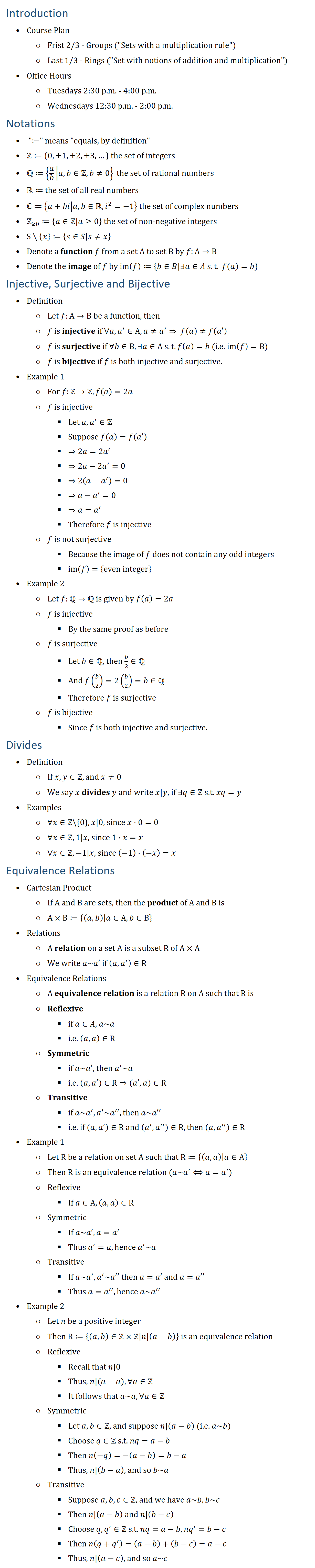 Introduction • Course Plan ○ Frist 2/3 - Groups (“Sets with a multiplication rule”) ○ Last 1/3 - Rings (“Set with notions of addition and multiplication”) • Office Hours ○ Tuesdays 2:30 p.m. - 4:00 p.m. ○ Wednesdays 12:30 p.m. - 2:00 p.m. Notations • “□(≔)” means “equals, by definition” • Z≔{0,±1,±2,±3,…} the set of integers • Q≔{a/b│a,b∈Zb≠0} • R≔ the set of all real numbers • ℂ≔{a+bi│a,b∈Ri^2=−1} • Z(≥0)≔{a∈Za≥0} • S∖{x}≔{s∈S│s≠x} • Denote a function f from a set A to set B by f:A→B • Denote the image of f by im(f)≔{b∈B│∃a∈A s.t. f(a)=b} Injective, Surjective and Bijective • Definition ○ Let f:A→B be a function, then ○ f is injective if ∀a,a^′∈A, a≠a^′, f(a)≠f(a′) ○ f is surjective if ∀b∈B, ∃a∈A s.t. f(a)=b (i.e. im(f)=B) ○ f is bijective if f is both injective and surjective. • Example 1 ○ For f:Z→Z, f(a)=2a ○ f is injective § Let a,a^′∈Z § Suppose f(a)=f(a′) § ⇒2a=2a^′ § ⇒2a−2a^′=0 § ⇒2(a−a^′ )=0 § ⇒a−a^′=0 § ⇒a=a^′ § Therefore f is injective ○ f is not surjective § Because the image of f does not contain any odd integers § im(f)={even integer} • Example 2 ○ Let f:Q→Q is given by f(a)=2a ○ f is injective § By the same proof as before ○ f is surjective § Let b∈Q, then b/2∈Q § And f(b/2)=2(b/2)=b∈Q § Therefore f is surjective ○ f is bijective § Since f is both injective and surjective. Divides • Definition ○ If x,y∈Z, and x≠0 ○ We say x divides y and write x|y, if ∃q∈Z s.t. xq=y • Examples ○ ∀x∈Z\{0}, x|0, since x⋅0=0 ○ ∀x∈Z, 1|x, since 1⋅x=x ○ ∀x∈Z, −1|x, since (−1)⋅(−x)=x Equivalence Relations • Product of Two Sets ○ If A and B are sets, then the product of A and B is ○ A×B≔{(a,b)│a∈A, b∈B} • Relations ○ A relation on a set A is a subset R of A×A ○ We write a~a′ if (a,a^′ )∈R • Equivalence Relations ○ A equivalence relation is a relation R on A such that R is ○ Reflexive § if a∈A, a~a § i.e. (a,a)∈R ○ Symmetric § if a~a′, then a^′~a § i.e. (a,a′)∈R⇒(a′,a)∈R ○ Transitive § if a~a^′, a′~a′′, then a~a′′ § i.e. if (a,a′)∈R and (a′,a′′ )∈R, then (a,a^′′ )∈R • Example 1 ○ Let R be a relation on set A such that R≔{(a,a)│a∈A} ○ Then R is an equivalence relation (a~a′⟺a=a′) ○ Reflexive § If a∈A,(a,a)∈R ○ Symmetric § If a~a′,a=a^′ § Thus a^′=a, hence a^′~a ○ Transitive § If aa′,a′a′′ then a=a′ and a=a′′ § Thus a=a^′′, hence a~a^′′ • Example 2 ○ Let n be a positive integer ○ Then R≔{(a,b)∈ZZn|(a−b) } is an equivalence relation ○ Reflexive § Recall that n|0 § Thus, n|(a−a), ∀a∈Z § It follows that a~a,∀a∈Z ○ Symmetric § Let a,b∈Z, and suppose n|(a−b) (i.e. a~b) § Choose q∈Z s.t. nq=a−b § Then n(−q)=−(a−b)=b−a § Thus, n|(b−a), and so b~a ○ Transitive § Suppose a,b,c∈Z, and we have a~b, b~c § Then n|(a−b) and n|(b−c) § Choose q,q^′∈Z s.t. nq=a−b, nq^′=b−c § Then n(q+q^′ )=(a−b)+(b−c)=a−c § Thus, n|(a−c), and so a~c