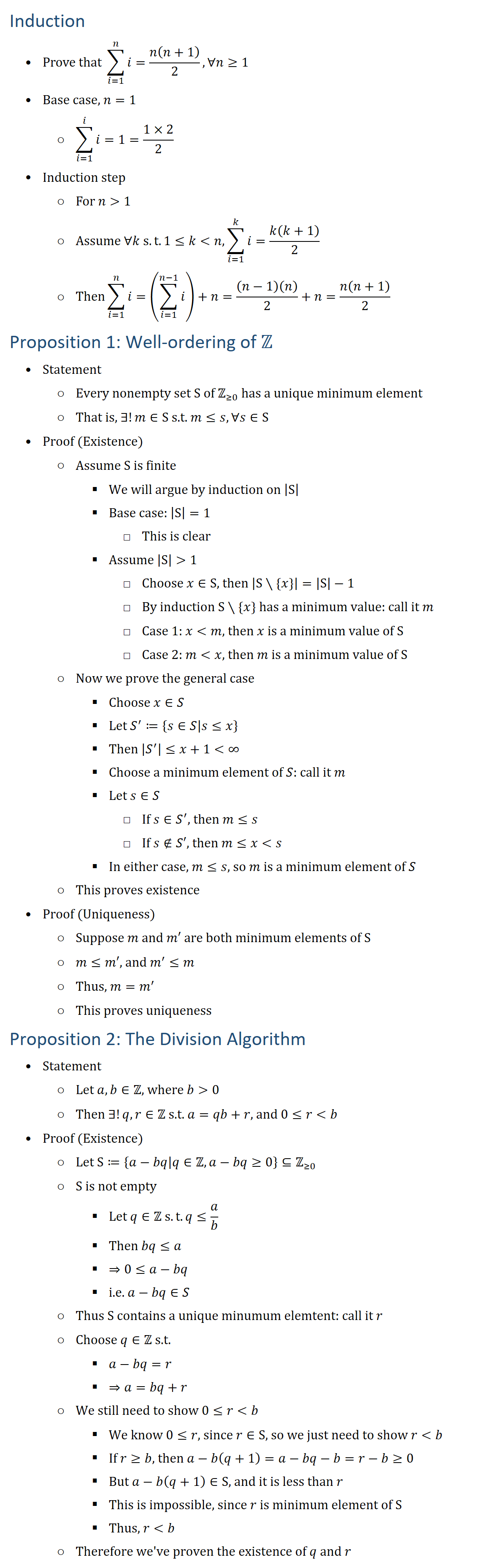 Induction • Prove that ∑_(i=1)^n▒i=n(n+1)/2, ∀n≥1 • Base case, n=1 ○ ∑_(i=1)^i▒i=1=(1×2)/2 • Induction step ○ For n 1 ○ Assume ∀k s.t. 1≤kn, ∑_(i=1)^k▒i=k(k+1)/2 ○ Then∑_(i=1)n▒i=(∑_(i=1)(n−1)▒i)+n=(n−1)(n)/2+n=n(n+1)/2 Proposition 1: Well-ordering of Z • Statement ○ Every nonempty set S of Z(≥0) has a unique minimum element ○ That is, ∃!m∈S s.t. m≤s, ∀s∈S • Proof (Existence) ○ Assume S is finite § We will argue by induction on |S| § Base case: |S|=1 □ This is clear § Assume |S| 1 □ Choose x∈S, then |S∖{x}|=|S|−1 □ By induction S∖\x} has a minimum value: call it m □ Case 1: xm, then x is a minimum value of S □ Case 2: mx, then m is a minimum value of S ○ Now we prove the general case § Choose x∈S § Let S^′≔{s∈S│s≤x} § Then |S^′ |≤x+1∞ § Choose a minimum element of S: call it m § Let s∈S □ If s∈S^′, then m≤s □ If s∉S′, then m≤xs § In either case, m≤s, so m is a minimum element of S ○ This proves existence • Proof (Uniqueness) ○ Suppose m and m′ are both minimum elements of S ○ m≤m′, and m^′≤m ○ Thus, m=m^′ ○ This proves uniqueness Proposition 2: The Division Algorithm • Statement ○ Let a,b∈Z, where b 0 ○ Then ∃!q,r∈Z s.t. a=qb+r, and 0≤rb • Proof (Existence) ○ Let S≔{a−bq│q∈Za−bq≥0}⊆Z(≥0) ○ S is not empty § Let q∈Z s.t. q≤a/b § Then bq≤a § ⇒0≤a−bq § i.e. a−bq∈S ○ Thus S contains a unique minumum elemtent: call it r ○ Choose q∈Z s.t. § a−bq=r § ⇒a=bq+r ○ We still need to show 0≤rb § We know 0≤r, since r∈S, so we just need to show rb § If r≥b, then a−b(q+1)=a−bq−b=r−b≥0 § But a−b(q+1)∈S, and it is less than r § This is impossible, since r is minimum element of S § Thus, rb ○ Therefore we ve proven the existence of q and r