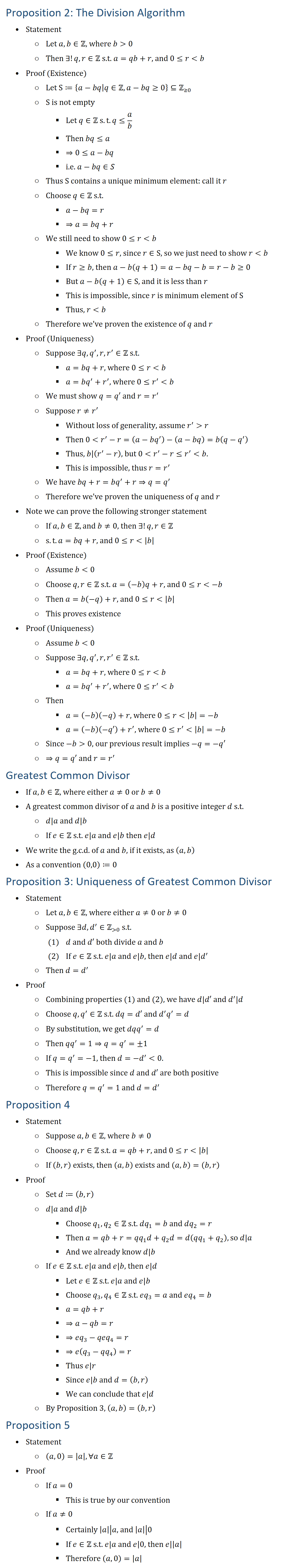 Proposition 2: The Division Algorithm • Statement ○ Let a,b∈Z, where b 0 ○ Then ∃!q,r∈Z s.t. a=qb+r, and 0≤r b • Proof (Existence) ○ Let S≔{a−bq│q∈Za−bq≥0}⊆Z(≥0) ○ S is not empty § Let q∈Z s.t. q≤a/b § Then bq≤a § ⇒0≤a−bq § i.e. a−bq∈S ○ Thus S contains a unique minumum elemtent: call it r ○ Choose q∈Z s.t. § a−bq=r § ⇒a=bq+r ○ We still need to show 0≤r b § We know 0≤r, since r∈S, so we just need to show r b § If r≥b, then a−b(q+1)=a−bq−b=r−b≥0 § But a−b(q+1)∈S, and it is less than r § This is impossible, since r is minimum element of S § Thus, r b ○ Therefore we ve proven the existence of q and r • Proof (Uniqueness) ○ Suppose ∃q,q′,r,r′∈Z s.t. § a=bq+r, where 0≤r b § a=bq′+r′, where 0≤r^′ b ○ We must show q=q′ and r=r^′ ○ Suppose r≠r^′ § Without loss of generality, assume r^′ r § Then 0 r′−r=(a−bq′ )−(a−bq)=b(q−q^′ ) § Thus, ├ b┤|├ (r^′−r)┤, but 0 r′−r≤r′ b. § This is impossible, thus r=r^′ ○ We have bq+r=bq′+r⇒q=q′ ○ Therefore we ve proven the uniqueness of q and r • Note we can prove the following stronger statement ○ If a,b∈Z, and b≠0, then ∃!q,r∈Z ○ s.t. a=bq+r, and 0≤r |b| • Proof (Existence) ○ Assume b 0 ○ Choose q,r∈Z s.t. a=(−b)q+r, and 0≤r −b ○ Then a=b(−q)+r, and 0≤r |b| ○ This proves existence • Proof (Uniqueness) ○ Assume b 0 ○ Suppose ∃q,q′,r,r′∈Z s.t. § a=bq+r, where 0≤r b § a=bq′+r′, where 0≤r^′ b ○ Then § a=(−b)(−q)+r, where 0≤r |b|=−b § a=(−b)(−q′)+r^′, where 0≤r^′ |b|=−b ○ Since −b 0, our previous result implies −q=−q^′ ○ ⇒q=q′ and r=r^′ Greatest Common Divisor • If a,b∈Z, where either a≠0 or b≠0 • A greatest common divisor of a and b is a positive integer d s.t. ○ d|a and d|b ○ If e∈Z s.t. e|a and e|b then e|d • We write the g.c.d. of a and b, if it exists, as (a,b) • As a convention (0,0)≔0 Proposition 3: Uniqueness of Greatest Common Divisor • Statement ○ Let a,b∈Z, where either a≠0 or b≠0 ○ Suppose ∃d,d^′∈Z( 0) s.t. (1) d and d′ both divide a and b (2) If e∈Z s.t. e|a and e|b, then e|d and e|d^′ ○ Then d=d^′ • Proof ○ Combining properties (1) and (2), we have d|d′ and d^′ |d ○ Choose q,q^′∈Z s.t. dq=d′ and d^′ q^′=d ○ By substitution, we get dqq^′=d ○ Then qq′=1⇒q=q′=±1 ○ If q=q^′=−1, then d=−d^′ 0. ○ This is impossible since d and d′ are both positive ○ Therefore q=q^′=1 and d=d^′ Proposition 4 • Statement ○ Suppose a,b∈Z, where b≠0 ○ Choose q,r∈Z s.t. a=qb+r, and 0≤r |b| ○ If (b,r) exists, then (a,b) exists and (a,b)=(b,r) • Proof ○ Set d≔(b,r) ○ d|a and d|b § Choose q_1,q_2∈Z s.t. dq_1=b and dq_2=r § Then a=qb+r=qq_1 d+q_2 d=d(qq_1+q_2 ), so d|a § And we already know d|b ○ If e∈Z s.t. e|a and e|b, then e|d § Let e∈Z s.t. e|a and e|b § Choose q_3,q_4∈Z s.t. eq_3=a and eq_4=b § a=qb+r § ⇒a−qb=r § ⇒eq_3−qeq_4=r § ⇒e(q_3−qq_4 )=r § Thus e|r § Since e|b and d=(b,r) § We can conclude that e|d ○ By Proposition 3, (a,b)=(b,r) Proposition 5 • Statement ○ (a,0)=|a|,∀a∈Z • Proof ○ If a=0 § This is true by our convention ○ If a≠0 § Certainly ├ |a|┤|├ a┤, and ├ |a|┤|├ 0┤ § If e∈Z s.t. e|a and ├ e┤|├ 0┤, then ├ e┤|├ |a|┤ § Therefore (a,0)=|a|