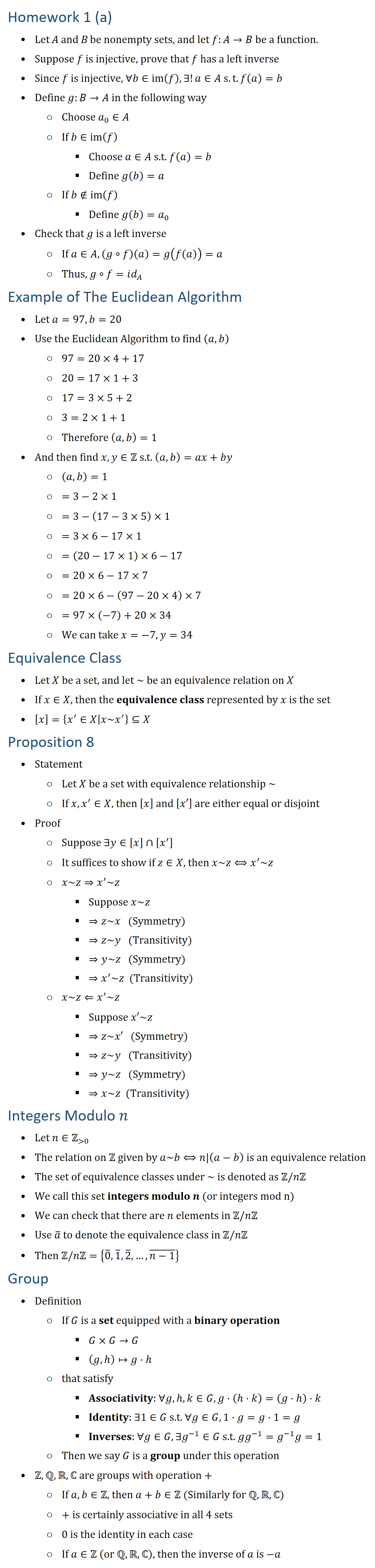 Homework 1 (a) • Let A and B be nonempty sets, and let f:A→B be a function. • Suppose f is injective, prove that f has a left inverse • Since f is injective, ∀b∈im(f),∃!a∈A s.t. f(a)=b • Define g:B→A in the following way ○ Choose a_0∈A ○ If b∈im(f) § Choose a∈A s.t. f(a)=b § Define g(b)=a ○ If b∉im(f) § Define g(b)=a_0 • Check that g is a left inverse ○ If a∈A, (g∘f)(a)=g(f(a))=a ○ Thus, g∘f=id_A Example of The Euclidean Algorithm • Let a=97, b=20 • Use the Euclidean Algorithm to find (a,b) ○ 97=20×4+17 ○ 20=17×1+3 ○ 17=3×5+2 ○ 3=2×1+1 ○ Therefore (a,b)=1 • And then find x,y∈Z s.t. (a,b)=ax+by ○ (a,b)=1 ○ =3−2×1 ○ =3−(17−3×5)×1 ○ =3×6−17×1 ○ =(20−17×1)×6−17 ○ =20×6−17×7 ○ =20×6−(97−20×4)×7 ○ =97×(−7)+20×34 ○ We can take x=−7, y=34 Equivalence Class • Let X be a set, and let ~ be an equivalence relation on X • If x∈X, then the equivalence class represented by x is the set • [x]={x′∈X│x~x′ }⊆X Proposition 8 • Statement ○ Let X be a set with equivalence relationship ~ ○ If x,x^′∈X, then [x] and [x′] are either equal or disjoint • Proof ○ Suppose ∃y∈[x]∩[x^′ ] ○ It suffices to show if z∈X, then xz⟺x^′z ○ xz⇒x^′z § Suppose x~z § ⇒z~x (Symmetry) § ⇒z~y (Transitivity) § ⇒y~z (Symmetry) § ⇒x^′~z (Transitivity) ○ xz⇐x^′z § Suppose x′~z § ⇒z~x′ (Symmetry) § ⇒z~y (Transitivity) § ⇒y~z (Symmetry) § ⇒x~z (Transitivity) Integers Modulo n • Let n∈Z( 0) • The relation on Z given by a~b⟺n|(a−b) is an equivalence relation • The set of equivalence classes under ~ is denoted as Z\nZ • We call this set integers modulo n (or integers mod n) • We can check that there are n elements in Z\nZ • Use a ̅ to denote the equivalence class in Z\nZ • Then Z\nZ={0 ̅,1 ̅,2 ̅,…,(n−1) ̅ } Group • Definition ○ If G is a set equipped with a binary operation § G×G→G § (g,h↦g⋅h ○ that satisfy § Associativity: ∀g,h,k∈G, g⋅(hk)=(g⋅h⋅k § Identity: ∃1∈G s.t. ∀g∈G,1⋅g=g⋅1=g § Inverses: ∀g∈G, ∃g^(−1)∈G s.t. gg(−1)=g(−1) g=1 ○ Then we say G is a group under this operation • Z,Q,R,ℂ are groups with operation + ○ If a,b∈Z, then a+b∈Z (Similarly for Q,R,ℂ) ○ + is certainly associative in all 4 sets ○ 0 is the identity in each case ○ If a∈Z (or QRℂ), then the inverse of a is −a