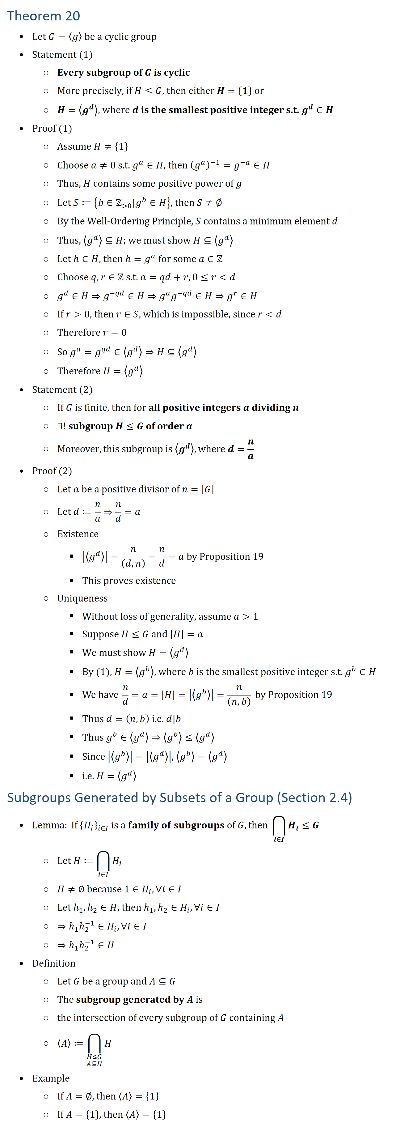Theorem 20 • Let G=⟨g⟩ be a cyclic group • Statement (1) ○ Every subgroup of G is cyclic ○ More precisely, if H≤G, then either H={1} or ○ H=⟨g^d ⟩, where d is the smallest positive integer s.t. g^d∈H • Proof (1) ○ Assume H≠{1} ○ Choose a≠0 s.t. g^a∈H, then (g^a )(−1)=g(−a)∈H ○ Thus, H contains some positive power of g ○ Let S≔{b∈Z( 0) |g^b∈H}, then S≠∅ ○ By the Well-Ordering Principle, S contains a minimum element d ○ Thus, ⟨g^d ⟩⊆H; we must show H⊆⟨g^d ⟩ ○ Let h∈H, then h=g^a for some a∈Z ○ Choose q,r∈Z s.t. a=qd+r, 0≤r d ○ gd∈H⇒g(−qd)∈H⇒g^a g(−qd)∈H⇒gr∈H ○ If r 0, then r∈S, which is impossible, since r d ○ Therefore r=0 ○ So ga=gqd∈⟨g^d ⟩⇒H⊆⟨g^d ⟩ ○ Therefore H=⟨g^d ⟩ • Statement (2) ○ If G is finite, then for all positive integers a dividing n ○ ∃! subgroup H≤G of order a ○ Moreover, this subgroup is ⟨g^d ⟩, where d=n/a • Proof (2) ○ Let a be a positive divisor of n=|G| ○ Let d≔n/a⇒n/d=a ○ Existence § |⟨g^d ⟩|=n/((d,n) )=n/d=a by Proposition 19 § This proves existence ○ Uniqueness § Without loss of generality, assume a 1 § Suppose H≤G and |H|=a § We must show H=⟨g^d ⟩ § By (1), H=⟨g^b ⟩, where b is the smallest positive integer s.t. g^b∈H § We have n/d=a=|H|=|⟨g^b ⟩|=n/((n,b) ) by Proposition 19 § Thus d=(n,b) i.e. d|b § Thus gb∈⟨gd ⟩⇒⟨g^b ⟩≤⟨g^d ⟩ § Since |⟨g^b ⟩|=|⟨g^d ⟩|, ⟨g^b ⟩=⟨g^d ⟩ § i.e. H=⟨g^d ⟩ Subgroups Generated by Subsets of a Group (Section 2.4) • Lemma: If {H_i }_(i∈I) is a family of subgroups of G, then ⋂136_(i∈I)▒〖H_i≤G〗 ○ Let H≔⋂136_(i∈I)▒H_i ○ H≠∅ because 1∈H_i, ∀i∈I ○ Let h1,h2∈H, then h1,h2∈H_i, ∀i∈I ○ ⇒h1 h2^(−1)∈H_i,∀i∈I ○ ⇒h1 h2^(−1)∈H • Definition ○ Let G be a group and A⊆G ○ The subgroup generated by A is ○ the intersection of every subgroup of G containing A ○ ⟨A⟩≔⋂8_█(H≤G@A⊆H)▒H • Example ○ If A=∅, then ⟨A⟩={1} ○ If A={1}, then ⟨A⟩={1}
