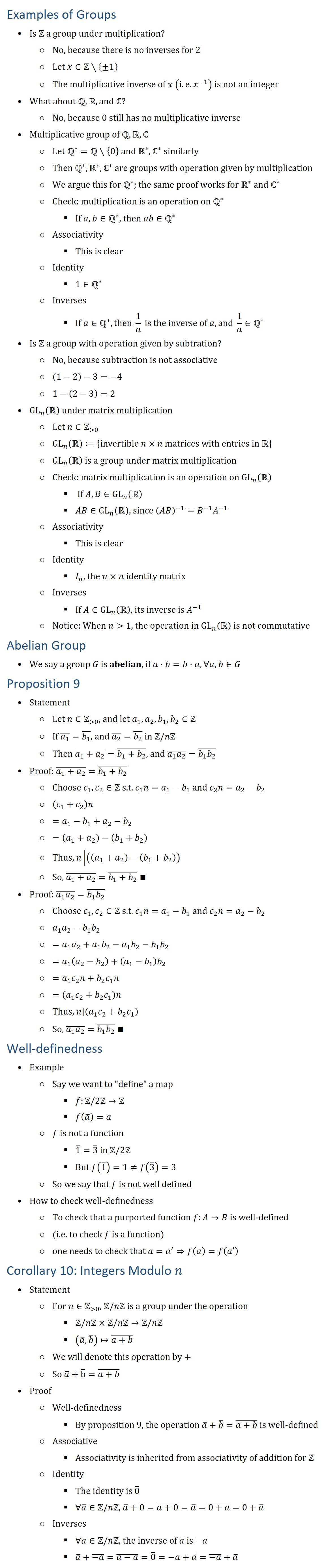 Examples of Groups • Is Z a group under multiplication? ○ No, because there is no inverses for 2 ○ Let x∈Z∖{±1} ○ The multiplicative inverse of x (i.e. 1/x) is not an integer • What about Q,R, and ℂ? ○ No, because 0 still has no multiplicative inverse • Multiplicative group of Q,R,ℂ ○ Let Q∗=Q∖{0} and R∗, ℂ^∗ similarly ○ Then Q∗,R∗,ℂ^∗ are groups with operation given by multiplication ○ We argue this for Q∗; the same proof works for R∗ and ℂ^∗ ○ Check: multiplication is an operation on Q∗ § If a,b∈Q∗, then ab∈Q∗ ○ Associativity § This is clear ○ Identity § 1∈Q∗ ○ Inverses § If a∈Q∗, then 1/a is the inverse of a, and 1/a∈Q∗ • Is Z a group with operation given by subtration? ○ No, because subtraction is not associative ○ (1−2)−3=−4 ○ 1−(2−3)=2 • GL_n (R under matrix multiplication ○ Let n∈Z( 0) ○ GL_n (R≔{invertible n×n matrices with entries in R ○ GL_n (R is a group under matrix multiplication ○ Check: matrix multiplication is an operation on GL_n (R § If A,B∈GL_n (R § AB∈GL_n (R, since (AB)(−1)=B(−1) A^(−1) ○ Associativity § This is clear ○ Identity § I_n, the n×n identity matrix ○ Inverses § If A∈GL_n (R, its inverse is A^(−1) ○ Notice: When n 1, the operation in GL_n (R is not commutative Abelian Group • We say a group G is abelian, if ∀a,b∈G, a⋅b=b⋅a Proposition 9 • Statement ○ Let n∈Z( 0), and let a_1,a_2,b_1,b_2∈Z ○ If (a_1 ) ̅=(b_1 ) ̅, and (a_2 ) ̅=(b_2 ) ̅ in Z\nZ ○ Then (a_1+a_2 ) ̅=(b_1+b_2 ) ̅, and (a_1 a_2 ) ̅=(b_1 b_2 ) ̅ • Proof: (a_1+a_2 ) ̅=(b_1+b_2 ) ̅ ○ Choose c_1,c_2∈Z s.t. c_1 n=a_1−b_1 and c_2 n=a_2−b_2 ○ (c_1+c_2 )n ○ =a_1−b_1+a_2−b_2 ○ =(a_1+a_2 )−(b_1+b_2 ) ○ Thus, ├ n┤|├ ((a_1+a_2 )−(b_1+b_2 ))┤ ○ So, (a_1+a_2 ) ̅=(b_1+b_2 ) ̅ ∎ • Proof: (a_1 a_2 ) ̅=(b_1 b_2 ) ̅ ○ Choose c_1,c_2∈Z s.t. c_1 n=a_1−b_1 and c_2 n=a_2−b_2 ○ a_1 a_2−b_1 b_2 ○ =a_1 a_2+a_1 b_2−a_1 b_2−b_1 b_2 ○ =a_1 (a_2−b_2 )+(a_1−b_1 ) b_2 ○ =a_1 c_2 n+b_2 c_1 n ○ =(a_1 c_2+b_2 c_1 )n ○ Thus, n|(a_1 c_2+b_2 c_1 ) ○ So, (a_1 a_2 ) ̅=(b_1 b_2 ) ̅ ∎ Well-definedness • Example ○ Say we want to “define” a map § f:Z\2Z→Z § f(a ̅ )=a ○ f is not a function § 1 ̅=3 ̅ in Z\2Z § But f(1 ̅ )=1≠f(3 ̅ )=3 ○ So we say that f is not well defined • How to check well-definedness ○ To check that a purported function f:A→B is well-defined ○ (i.e. to check f is a function) ○ one needs to check that a=a^′⇒f(a)=f(a′) Corollary 10 (Integers Modulo n) • Statement ○ If n∈Z( 0), Z\nZ is a group under the operation § Z\nZ×Z\nZ→Z\nZ § (a ̅,b ̅ )↦(a+b) ̅ ○ We will denote this operation by + ○ So a ̅+b ̅=(a+b) ̅ • Proof ○ Well-definedness § By proposition 9, the operation a ̅+b ̅=(a+b) ̅ is well-defined ○ Associative § Associativity is inherited from associativity of addition for Z ○ Identity § The identity is 0 ̅ § ∀a ̅∈Z\nZ, a ̅+0 ̅=(a+0) ̅=a ̅=(0+a) ̅=0 ̅+a ̅ ○ Inverses § ∀a ̅∈Z\nZ, the inverse of a ̅ is (−a) ̅ § a ̅+(−a) ̅=(a−a) ̅=0 ̅=(−a+a) ̅=(−a) ̅+a ̅