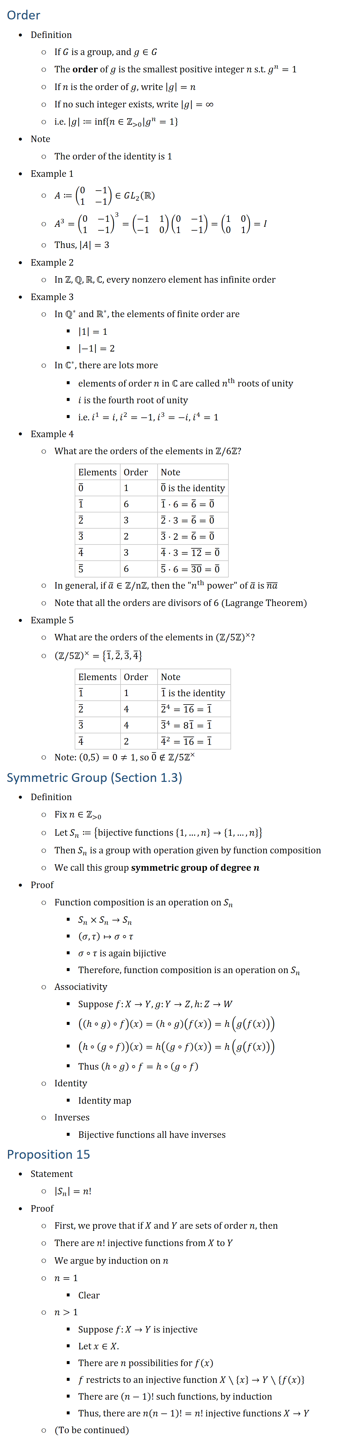 Examples of Orders • Example 1 ○ A≔(■8(0&−1@1&−1))∈GL_2 (R ○ A3=(■8(0&−1@1&−1))3=(■8(−1&1@−1&0))(■8(0&−1@1&−1))=(■8(1&0@0&1))=I ○ Thus, |A|=3 • Example 2 ○ In Z,Q,R,ℂ, every nonzero element has infinite order • Example 3 ○ In Q∗ and R∗, the elements of finite order are § |1|=1 § |−1|=2 ○ In ℂ^∗, there are lots more § elements of order n in ℂ are called n^th roots of unity § i is the fourth root of unity § i.e. i^1=i, i^2=−1, i^3=−i, i^4=1 • Example 4 ○ What are the orders of the elements in Z\6Z? Elements Order Note 0 ̅ 1 0 ̅ is the identity 1 ̅ 6 1 ̅⋅6=6 ̅=0 ̅ 2 ̅ 3 2 ̅⋅3=6 ̅=0 ̅ 3 ̅ 2 3 ̅⋅2=6 ̅=0 ̅ 4 ̅ 3 4 ̅⋅3=(12) ̅=0 ̅ 5 ̅ 6 5 ̅⋅6=(30) ̅=0 ̅ ○ In general, if a ̅∈Z\nZ, then the “n^th power” of a ̅ is (na) ̅ ○ Note that all the orders are divisors of 6 (Lagrange Theorem) • Example 5 ○ What are the orders of the elements in Z\5Z×? § Z\5Z×={1 ̅,2 ̅,3 ̅,4 ̅ } § (0,5)=0≠1, so 0 ̅∉Z\5Z× Elements Order Note 1 ̅ 1 1 ̅ is the identity 2 ̅ 4 2 ̅^4=(16) ̅=1 ̅ 3 ̅ 4 3 ̅^4=81 ̅=1 ̅ 4 ̅ 2 4 ̅^2=(16) ̅=1 ̅ Symmetric Groups (Section 1.3) • Symmetric Group of Degree n ○ n∈Z(0) ○ S_n≔{bijective functions {1,…,n}→{1,…,n}} ○ S_n is a group with operation given by composition of functions ○ Composition of functions is an operation on S_n § S_n×S_n→S_n § (σ,τ)↦σ∘τ § σ∘τ is again bijictive, so this makes sense ○ Associativity § Suppose f:X→Y, g:Y→Z,h:Z→W § ((hg)∘f)(x)=(hg)(f(x))=h(g(f(x))) § (h(g∘f))(x)=h((g∘f)(x))=h(g(f(x))) § Thus (hg)∘f=h∘(g∘f) ○ Identity § Identity map ○ Inverses § Bijective functions have inverses Proposition 15 • Statement ○ |S_n |=n! • Proof ○ First, we prove that if X and Y are sets of order n, then ○ There are n! injective functions from X to Y ○ We argue by induction on n ○ n=1 § Clear ○ n1 § Suppose f:X→Y is injective § Let x∈X. § There are n possibilities for f(x) § f restricts to an injective function X∖{x}→Y∖{f(x)} § There are (n−1)! such functions, by induction § Thus, there are n(n−1)!=n! injective functions X→Y ○ (To be continued)