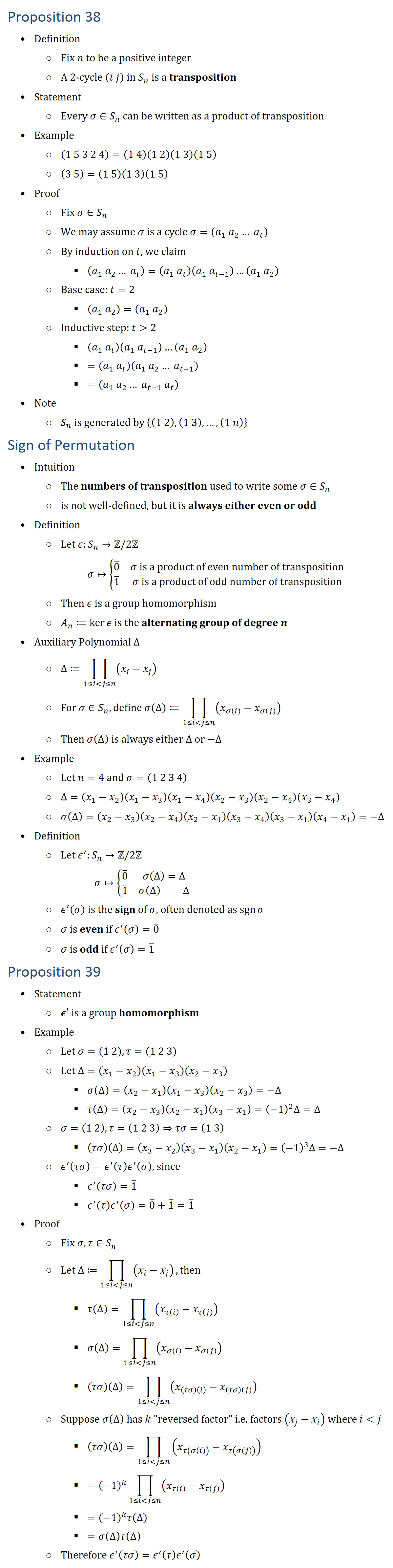Proposition 38 • Definition ○ Fix n to be a positive integer ○ A 2\cycle (i j) in S_n is a transposition • Statement ○ Every σ∈S_n can be written as a product of transposition • Example ○ (1 5 3 2 4)=(1 4)(1 2)(1 3)(1 5) ○ (3 5)=(1 5)(1 3)(1 5) • Proof ○ Fix σ∈S_n ○ We may assume σ is a cycle σ=(a_1 a_2… a_t ) ○ By induction on t, we claim § (a_1 a_2… a_t )=(a_1 a_t )(a_1 a_(t−1) )…(a_1 a_2 ) ○ Base case: t=2 § (a_1 a_2 )=(a_1 a_2 ) ○ Inductive step: t 2 § (a_1 a_t )(a_1 a_(t−1) )…(a_1 a_2 ) § =(a_1 a_t )(a_1 a_2… a_(t−1) ) § =(a_1 a_2… a_(t−1) a_t ) • Note ○ S_n is generated by {(1 2),(1 3),…,(1 n)} Sign of Permutation • Intuition ○ The numbers of transposition used to write some σ∈S_n ○ is not well-defined, but it is always either even or odd • Definition ○ Let ϵ:S_n→Z\2Z σ↦{■8(0 ̅&σ is a product of even number of transposition@1 ̅&σ is a product of odd number of transposition)┤ ○ Then ϵ is a group homomorphism ○ A_n≔kerϵ is the alternating group of degree n • Auxiliary Polynomial Δ ○ Δ≔∏_(1≤i j≤n)▒(x_i−x_j ) ○ For σ∈S_n, define σ(Δ)≔∏_(1≤i j≤n)▒(x_σ(i) −x_σ(j) ) ○ Then σ(Δ) is always either Δ or −Δ • Example ○ Let n=4 and σ=(1 2 3 4) ○ Δ=(x_1−x_2 )(x_1−x_3 )(x_1−x_4 )(x_2−x_3 )(x_2−x_4 )(x_3−x_4 ) ○ σ(Δ)=(x_2−x_3 )(x_2−x_4 )(x_2−x_1 )(x_3−x_4 )(x_3−x_1 )(x_4−x_1 )=−Δ • Definition ○ Let ϵ^′:S_n→Z\2Z σ↦{■8(0 ̅&σ(Δ)=Δ@1 ̅&σ(Δ)=−Δ)┤ ○ ϵ^′ (σ) is the sign of σ, often denoted as sgnσ ○ σ is even if ϵ^′ (σ)=0 ̅ ○ σ is odd if ϵ^′ (σ)=1 ̅ Proposition 39 • Statement ○ ϵ′ is a group homomorphism • Example ○ Let σ=(1 2), τ=(1 2 3) ○ Let Δ=(x_1−x_2 )(x_1−x_3 )(x_2−x_3 ) § σ(Δ)=(x_2−x_1 )(x_1−x_3 )(x_2−x_3 )=−Δ § τ(Δ)=(x_2−x_3 )(x_2−x_1 )(x_3−x_1 )=(−1)^2 Δ=Δ ○ σ=(1 2), τ=(1 2 3)⇒τσ=(1 3) § (τσ)(Δ)=(x_3−x_2 )(x_3−x_1 )(x_2−x_1 )=(−1)^3 Δ=−Δ ○ ϵ^′ (τσ)=ϵ^′ (τ) ϵ^′ (σ), since § ϵ^′ (τσ)=1 ̅ § ϵ^′ (τ) ϵ^′ (σ)=0 ̅+1 ̅=1 ̅ • Proof ○ Fix σ,τ∈S_n ○ Let Δ≔∏_(1≤i j≤n)▒(x_i−x_j ) , then § τ(Δ)=∏_(1≤i j≤n)▒(x_τ(i) −x_τ(j) ) § σ(Δ)=∏_(1≤i j≤n)▒(x_σ(i) −x_σ(j) ) § (τσ)(Δ)=∏_(1≤i j≤n)▒(x_(τσ)(i) −x_(τσ)(j) ) ○ Suppose σ(Δ) has k “reversed factor” i.e. factors (x_j−x_i ) where i j § (τσ)(Δ)=∏_(1≤i j≤n)▒(x_τ(σ(i)) −x_τ(σ(j)) ) § =(−1)^k ∏_(1≤i j≤n)▒(x_τ(i) −x_τ(j) ) § =(−1)^k τ(Δ) § =σ(Δ)τ(Δ) ○ Therefore ϵ^′ (τσ)=ϵ^′ (τ) ϵ^′ (σ)