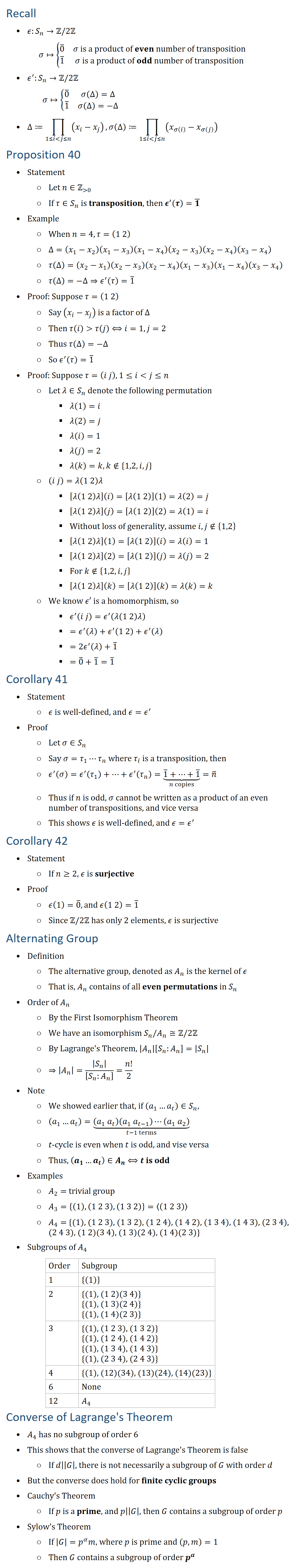 Recall • ϵ:S_n→Z\2Z σ↦{■8(0 ̅&σ is a product of even number of transposition@1 ̅&σ is a product of odd number of transposition)┤ • ϵ^′:S_n→Z\2Z σ↦{■8(0 ̅&σ(Δ)=Δ@1 ̅&σ(Δ)=−Δ)┤ • Δ≔∏_(1≤i j≤n)▒(x_i−x_j ) , σ(Δ)≔∏_(1≤i j≤n)▒(x_σ(i) −x_σ(j) ) Proposition 40 • Statement ○ Let n∈Z( 0) ○ If τ∈S_n is transposition, then ϵ^′ (τ)=1 ̅ • Example ○ When n=4, τ=(1 2) ○ Δ=(x_1−x_2 )(x_1−x_3 )(x_1−x_4 )(x_2−x_3 )(x_2−x_4 )(x_3−x_4 ) ○ τ(Δ)=(x_2−x_1 )(x_2−x_3 )(x_2−x_4 )(x_1−x_3 )(x_1−x_4 )(x_3−x_4 ) ○ τ(Δ)=−Δ⇒ϵ^′ (τ)=1 ̅ • Proof: Suppose τ=(1 2) ○ Say (x_i−x_j ) is a factor of Δ ○ Then τ(i) τ(j)⟺i=1,j=2 ○ Thus τ(Δ)=−Δ ○ So ϵ^′ (τ)=1 ̅ • Proof: Suppose τ=(i j), 1≤i j≤n ○ Let λ∈S_n denote the following permutation § λ(1)=i § λ(2)=j § λ(i)=1 § λ(j)=2 § λ(k)=k,k∉{1,2,i,j} ○ (i j)=λ(1 2)λ § [λ(1 2)λ](i)=[λ(1 2)](1)=λ(2)=j § [λ(1 2)λ](j)=[λ(1 2)](2)=λ(1)=i § Without loss of generality, assume i,j∉{1,2} § [λ(1 2)λ](1)=[λ(1 2)](i)=λ(i)=1 § [λ(1 2)λ](2)=[λ(1 2)](j)=λ(j)=2 § For k∉{1,2,i,j} § [λ(1 2)λ](k)=[λ(1 2)](k)=λ(k)=k ○ We know ϵ′ is a homomorphism, so § ϵ^′ (i j)=ϵ^′ (λ(1 2)λ) § =ϵ^′ (λ)+ϵ^′ (1 2)+ϵ^′ (λ) § =2ϵ^′ (λ)+1 ̅ § =0 ̅+1 ̅=1 ̅ Corollary 41 • Statement ○ ϵ is well-defined, and ϵ=ϵ^′ • Proof ○ Let σ∈S_n ○ Say σ=τ_1⋯τ_n where τ_i is a transposition, then ○ ϵ^′ (σ)=ϵ^′ (τ_1 )+…+ϵ^′ (τ_n )=⏟(1 ̅+⋯+1 ̅ )┬(n copies)=n ̅ ○ Thus if n is odd, σ cannot be written as a product of an even number of transpositions, and vice versa ○ This shows ϵ is well-defined, and ϵ=ϵ^′ Corollary 42 • Statement ○ If n≥2, ϵ is surjective • Proof ○ ϵ(1)=0 ̅, and ϵ(1 2)=1 ̅ ○ Since Z\2Z has only 2 elements, ϵ is surjective Alternating Group • Definition ○ The alternative group, denoted as A_n is the kernel of ϵ ○ That is, A_n contains of all even permutations in S_n • Order of A_n ○ By the First Isomorphism Theorem ○ We have an isomorphism S_n \A_n≅Z\2Z ○ By Lagrange s Theorem, |A_n |[S_n:A_n ]=|S_n | ○ ⇒|A_n |=|S_n |/[S_n:A_n ] =n!/2 • Note ○ We showed earlier that, if (a_1…a_t )∈S_n, ○ (a_1…a_t )=⏟((a_1 a_t )(a_1 a_(t−1) )⋯(a_1 a_2 ) )┬(t−1 terms) ○ t\cycle is even when t is odd, and vise versa ○ Thus, (a_1…a_t )∈A_n⟺t is odd • Examples ○ A_2= trivial group ○ A_3={(1), (1 2 3),(1 3 2)}=⟨(1 2 3)⟩ ○ A_4= {(1), (1 2 3), (1 3 2), (1 2 4), (1 4 2), (1 3 4), (1 4 3), (2 3 4), (2 4 3), (1 2)(3 4), (1 3)(2 4), (1 4)(2 3)} • Subgroups of A_4 Order Subgroup 1 {(1)} 2 3 cyclic subgroups 3 4 cyclic subgroups 4 Homework 6 None 12 A_4 Converse of Lagrange s Theorem • A_4 has no subgroup of order 6 • This shows that the converse of Lagrange s Theorem is false ○ If ├ d┤|├ |G|┤, there is not necessarily a subgroup of G with order d • But the converse does hold for finite cyclic groups • Cauchy s Theorem ○ If p is a prime, and ├ p┤|├ |G|┤, then G contains a subgroup of order p • Sylow s Theorem ○ If |G|=p^α m, where p is prime and p∤m ○ Then G contains a subgroup of order p^α