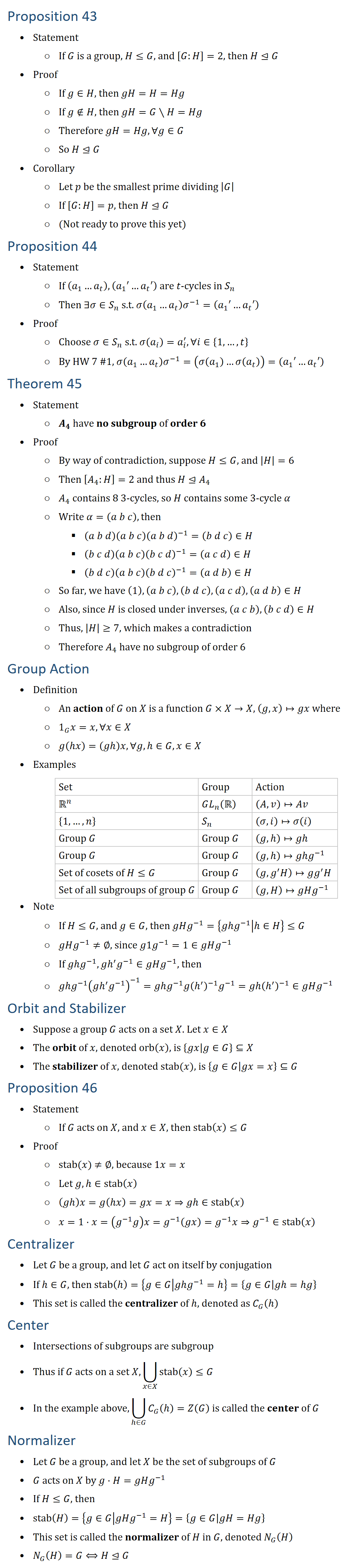 Proposition 43 • Statement ○ If G is a group, H≤G, and [G:H]=2, then H⊴G • Proof ○ If g∈H, then gH=H=Hg ○ If g∉H, then gH=G∖H=Hg ○ Therefore gH=Hg,∀g∈G ○ So H⊴G • Corollary ○ Let p be the smallest prime dividing |G| ○ If [G:H]=p, then H⊴G ○ (Not ready to prove this yet) Proposition 44 • Statement ○ If (a_1…a_t ),(a_1′…a_t′) are t-cycles in S_n ○ Then ∃σ∈S_n s.t. σ(a_1…a_t ) σ^(−1)=(a_1′…a_t′) • Proof ○ Choose σ∈S_n s.t. σ(a_i )=a_i^′, ∀i∈{1,…,t} ○ By HW 7 #1, σ(a_1…a_t ) σ^(−1)=(σ(a_1 )…σ(a_t ))=(a_1′…a_t′) Theorem 45 • Statement ○ A_4 have no subgroup of order 6 • Proof ○ By way of contradiction, suppose H≤G, and |H|=6 ○ Then [A_4:H]=2 and thus H⊴A_4 ○ A_4 contains 8 3-cycles, so H contains some 3-cycle α ○ Write α=(a b c), then § (a b d)(a b c) (a b d)^(−1)=(b d c)∈H § (b c d)(a b c) (b c d)^(−1)=(a c d)∈H § (b d c)(a b c) (b d c)^(−1)=(a d b)∈H ○ So far, we have (1), (a b c),(b d c),(a c d),(a d b)∈H ○ Also, since H is closed under inverses, (a c b),(b c d)∈H ○ Thus, |H|≥7, which makes a contradiction ○ Therefore A_4 have no subgroup of order 6 Group Action • Definition ○ An action of G on X is a function G×X→X, (g,x)↦gx where ○ 1_G x=x, ∀x∈X ○ g(h�)=(ghx,∀g,h∈G,x∈X • Examples Set Group Action Rn GL_n (R (A,v)↦Av {1,…,n} S_n (σ,i)↦σ(i) Group G Group G (g,h↦gh Group G Group G (g,h↦ghg^(−1) Set of cosets of H≤G Group G (g,g^′ H)↦gg^′ H Set of all subgroups of group G Group G (g,H)↦gHg^(−1) • Note ○ If H≤G, and g∈G, then gHg(−1)={gh�(−1)│hH}≤G ○ gHg^(−1)≠∅, since g1g(−1)=1∈gHg(−1) ○ If ghg^(−1),gh′ g(−1)∈gHg(−1), then ○ ghg^(−1) (gh′ g^(−1) )(−1)=ghg(−1) g(h′ )^(−1) g^(−1)=gh(h′ )(−1)∈gHg(−1) Orbit and Stabilizer • Suppose a group G acts on a set X. Let x∈X • The orbit of x, denoted orb(x), is {gx│g∈G}⊆X • The stabilizer of x, denoted stab(x), is {g∈G│gx=x}⊆G Proposition 46 • Statement ○ If G acts on X, and x∈X, then stab(x)≤G • Proof ○ stab(x) ≠∅, because 1x=x ○ Let g,h∈stab(x) ○ (ghx=g(h�)=gx=x⇒gh∈stab(x) ○ x=1⋅x=(g^(−1) g)x=g^(−1) (gx)=g^(−1) x⇒g^(−1)∈stab(x) Centralizer • Let G be a group, and let G act on itself by conjugation • If h∈G, then stab(h={g∈G│gh�^(−1)=h={g∈G│ghh�} • This set is called the centralizer of h, denoted as C_G (h Center • Intersections of subgroups are subgroup • Thus if G acts on a set X, ⋃8_(x∈X)▒stab(x) ≤G • In the example above, ⋃8_(hG)▒〖C_G (h 〗=Z(G) is called the center of G Normalizer • Let G be a group, and let X be the set of subgroups of G • G acts on X by g⋅H=gHg^(−1) • If H≤G, then • stab(H)={g∈G│gHg^(−1)=H}={g∈G│gH=Hg} • This set is called the normalizer of H in G, denoted N_G (H) • N_G (H)=G⟺H⊴G