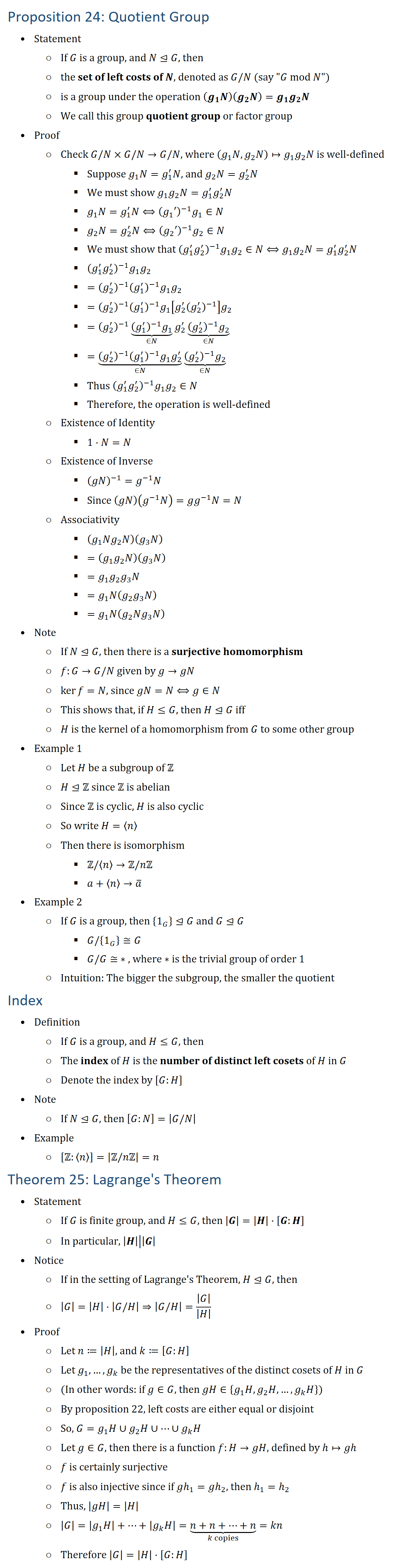Proposition 24: Quotient Group • Statement ○ If G is a group, and N⊴G, then ○ the set of left costs of N, denoted as G\N (say “G mod N”) ○ is a group under the operation (g_1 N)(g_2 N)=g_1 g_2 N ○ We call this group quotient group or factor group • Proof ○ Check G\N×G\N→G\N, where (g_1 N,g_2 N)↦g_1 g_2 N is well-defined § Suppose g_1 N=g_1^′ N, and g_2 N=g_2^′ N § We must show g_1 g_2 N=g_1^′ g_2^′ N § g_1 N=g_1^′ N⟺(g_1′)^(−1) g_1∈N § g_2 N=g_2^′ N⟺(g_2′)^(−1) g_2∈N § We must show that (g_1^′ g_2^′ )^(−1) g_1 g_2∈N⟺g_1 g_2 N=g_1^′ g_2^′ N § (g_1^′ g_2^′ )^(−1) g_1 g_2 § =(g_2^′ )^(−1) (g_1^′ )^(−1) g_1 g_2 § =(g_2^′ )^(−1) (g_1^′ )^(−1) g_1 [g_2^′ (g_2^′ )^(−1) ] g_2 § =(g_2^′ )^(−1) ⏟((g_1^′ )^(−1) g_1 )┬(∈N) g_2^′ ⏟((g_2^′ )^(−1) g_2 )┬(∈N) § =⏟((g_2^′ )^(−1) (g_1^′ )^(−1) g_1 g_2^′ )┬(∈N) ⏟((g_2^′ )^(−1) g_2 )┬(∈N) § Thus (g_1^′ g_2^′ )^(−1) g_1 g_2∈N § Therefore, the operation is well-defined ○ Existence of Identity § 1⋅N=N ○ Existence of Inverse § (gN)(−1)=g(−1) N § Since (gN)(g^(−1) N)=gg^(−1) N=N ○ Associativity § (g_1 Ng_2 N)(g_3 N) § =(g_1 g_2 N)(g_3 N) § =g_1 g_2 g_3 N § =g_1 N(g_2 g_3 N) § =g_1 N(g_2 Ng_3 N) • Note ○ If N⊴G, then there is a surjective homomorphism ○ f:G→G\N given by g→gN ○ kerf=N, since gN=N⟺g∈N ○ This shows that, if H≤G, then H⊴G iff ○ H is the kernel of a homomorphism from G to some other group • Example 1 ○ Let H be a subgroup of Z ○ H⊴Z since Z is abelian ○ Since Z is cyclic, H is also cyclic ○ So write H=⟨n⟩ ○ Then there is isomorphism § Z\⟨n⟩→Z\nZ § a+⟨n⟩→a ̅ • Example 2 ○ If G is a group, then {1_G }⊴G and G⊴G § G\{1_G }≅G § G\G≅ ∗ , where ∗ is the trivial group of order 1 ○ Intuition: The bigger the subgroup, the smaller the quotient Index • Definition ○ If G is a group, and H≤G, then ○ The index of H is the number of distinct left cosets of H in G ○ Denote the index by [G:H] • Note ○ If N⊴G, then [G:N]=|G/N| • Example ○ [Z⟨n⟩]=|ZnZ=n Theorem 25: Lagranges Theorem • Statement ○ If G is finite group, and H≤G, then |G|=|H|⋅[G:H] ○ In particular, ├ |H|┤|├ |G|┤ • Notice ○ If in the setting of Lagranges Theorem, H⊴G, then ○ |G|=|H|⋅|G/H|⇒|G/H|=|G|/|H| • Proof ○ Let n≔|H|, and k≔[G:H] ○ Let g_1,…,g_k be the representatives of the distinct cosets of H in G ○ (In other words: if g∈G, then gH∈{g_1 H,g_2 H,…,g_k H}) ○ By proposition 22, left costs are either equal or disjoint ○ So, G=g_1 H∪g_2 H∪…∪g_k H ○ Let g∈G, then there is a function f:H→gH, defined by h↦gh ○ f is certainly surjective ○ f is also injective since if gh1=gh2, then h1=h2 ○ Thus, |gH|=|H| ○ |G|=|g_1 H|+…+|g_k H|=⏟(n+n+…+n)┬(k copies)=kn ○ Therefore |G|=|H|⋅[G:H]