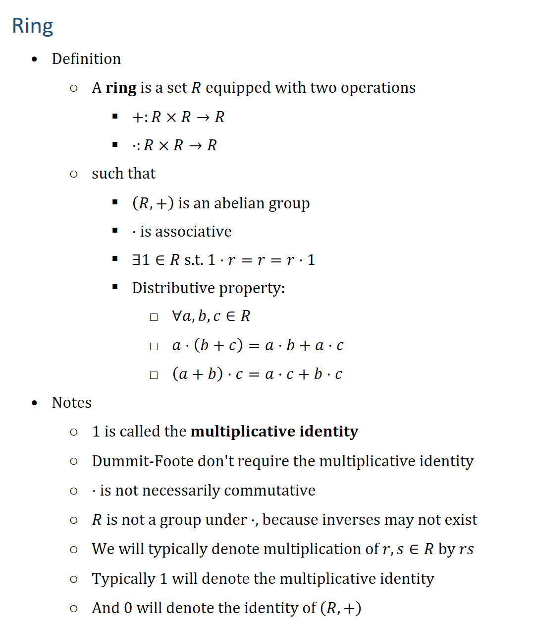 Ring • Definition ○ A ring is a set R equipped with two operations § +:R×R→R § ⋅:R×R→R ○ such that § (R,+) is an abelian group § ⋅ is associative § ∃1∈R s.t. 1⋅r=r=r⋅1 § Distributive property: □ ∀a,b,c∈R □ a⋅(b+c)=a⋅b+a⋅c □ (a+b)⋅c=a⋅c+b⋅c • Notes ○ 1 is called the multiplicative identity ○ Dummit-Foote don t require the multiplicative identity ○ ⋅ is not necessarily commutative ○ R is not a group under ⋅, because inverses may not exist ○ We will typically denote multiplication of r,s∈R by rs ○ Typically 1 will denote the multiplicative identity ○ And 0 will denote the identity of (R,+)