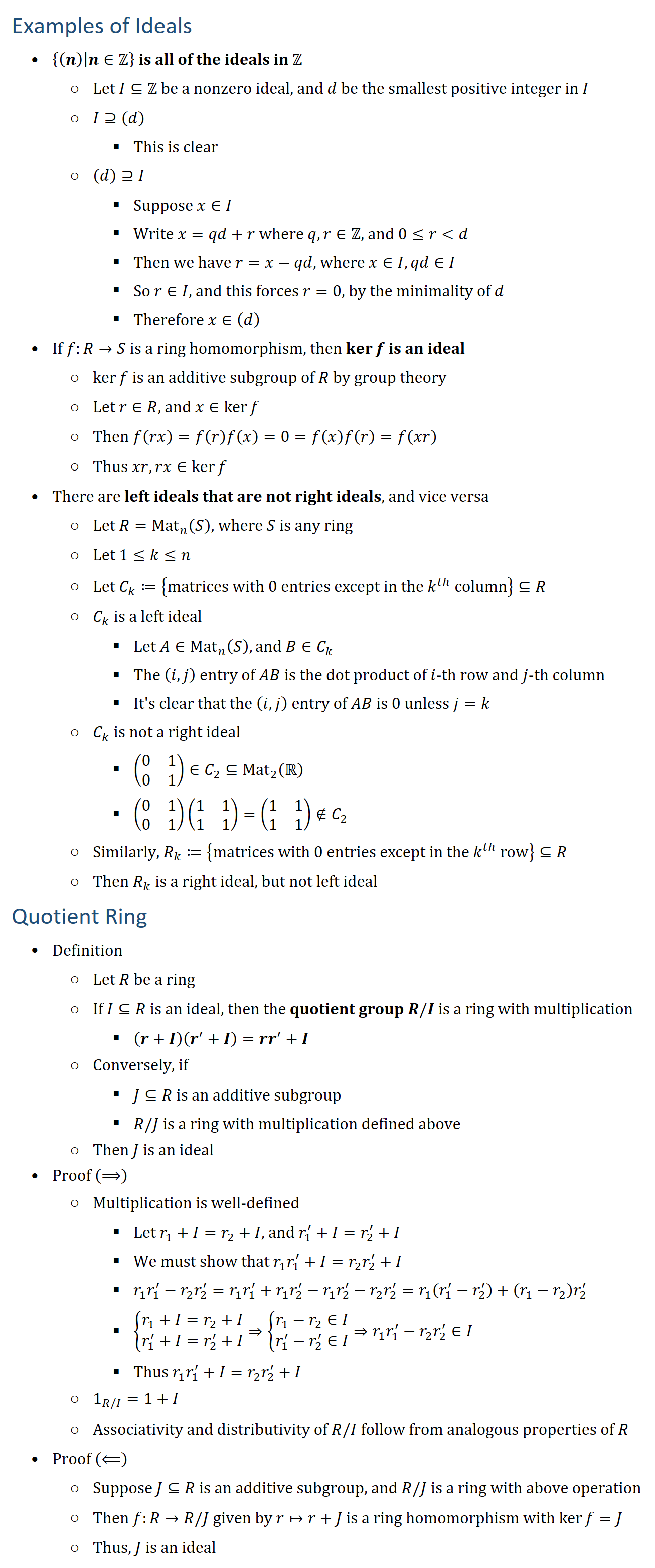 Examples of Ideals • {(n)│n∈Z is all of the ideals in Z ○ Let I⊆Z be a nonzero ideal, and d be the smallest positive integer in I ○ I⊇(d) § This is clear ○ (d)⊇I § Suppose x∈I § Write x=qd+r where q,r∈Z, and 0≤rd § Then we have r=x−qd, where x∈I,qd∈I § So r∈I, and this forces r=0, by the minimality of d § Therefore x∈(d) • If f:R→S is a ring homomorphism, then kerf is an ideal ○ kerf is an additive subgroup of R by group theory ○ Let r∈R, and x∈kerf ○ Then f(rx)=f(r)f(x)=0=f(x)f(r)=f(xr) ○ Thus xr,rx∈kerf • There are left ideals that are not right ideals, and vice versa ○ Let R=Mat_n (S), where S is any ring ○ Let 1≤k≤n ○ Let C_k≔{matrices with 0 entries except in the k^th column}⊆R ○ C_k is a left ideal § Let A∈Mat_n (S), and B∈C_k § The (i,j) entry of AB is the dot product of i-th row and j-th column § It s clear that the (i,j) entry of AB is 0 unless j=k ○ C_k is not a right ideal § (■8(0&1@0&1))∈C_2⊆Mat_2 (R § (■8(0&1@0&1))(■8(1&1@1&1))=(■8(1&1@1&1))∉C_2 ○ Similarly, R_k≔{matrices with 0 entries except in the k^th row}⊆R ○ Then R_k is a right ideal, but not left ideal Quotient Ring • Definition ○ Let R be a ring ○ If I⊆R is an ideal, then the quotient group R\I is a ring with multiplication § (r+I)(r′+I)=rr′+I ○ Conversely, if § J⊆R is an additive subgroup § R\J is a ring with multiplication defined above ○ Then J is an ideal • Proof (⟹) ○ Multiplication is well-defined § Let r_1+I=r_2+I, and r_1′+I=r_2′+I § We must show that r_1 r_1^′+I=r_2 r_2^′+I § r_1 r_1^′−r_2 r_2^′=r_1 r_1^′+r_1 r_2^′−r_1 r_2^′−r_2 r_2^′=r_1 (r_1′−r_2′ )+(r_1−r_2 ) r_2^′ § {█(r_1+I=r_2+I@r_1′+I=r_2′+I)┤⇒{█(r_1−r_2∈I@r_1′−r_2′∈I)┤⇒r_1 r_1^′−r_2 r_2^′∈I § Thus r_1 r_1^′+I=r_2 r_2^′+I ○ 1_(R/I)=1+I ○ Associativity and distributivity of R\I follow from analogous properties of R • Proof (⟸) ○ Suppose J⊆R is an additive subgroup, and R\J is a ring with above operation ○ Then f:R→R\J given by r↦r+J is a ring homomorphism with kerf=J ○ Thus, J is an ideal