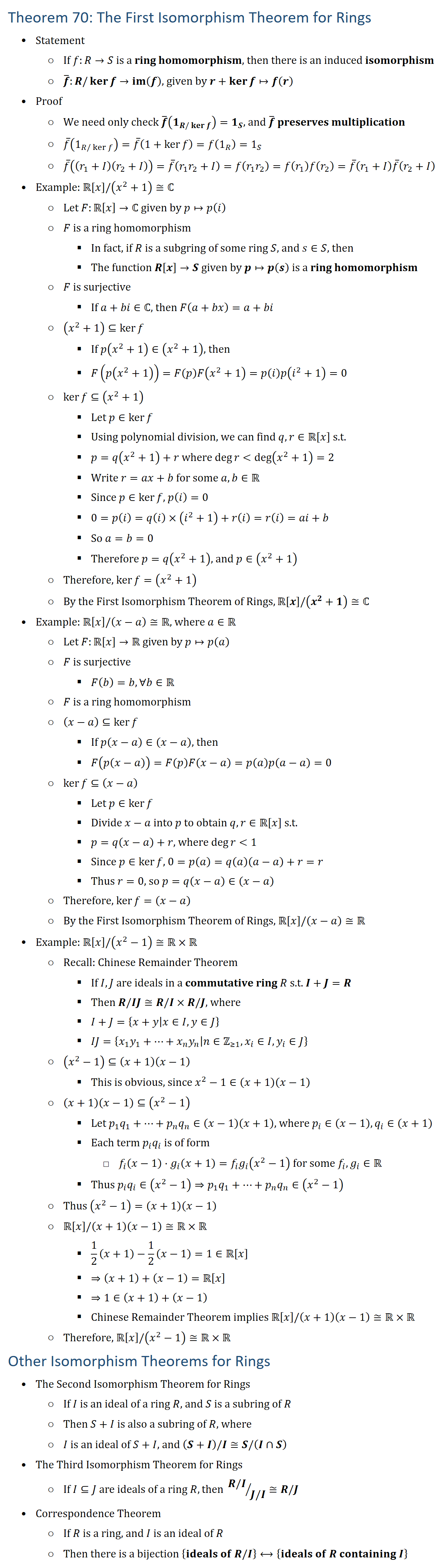 Theorem 70: The First Isomorphism Theorem for Rings • Statement ○ If f:R→S is a ring homomorphism, then there is an induced isomorphism ○ f ̅:R\kerf→im(f), given by r+kerf↦f(r) • Proof ○ We need only check f ̅(1_(R/kerf ) )=1_S, and f ̅ preserves multiplication ○ f ̅(1_(R/kerf ) )=f ̅(1+kerf )=f(1_R )=1_S ○ f ̅((r_1+I)(r_2+I))=f ̅(r_1 r_2+I)=f(r_1 r_2 )=f(r_1 )f(r_2 )=f ̅(r_1+I) f ̅(r_2+I) • Example: R[x]\(x^2+1)≅ℂ ○ Let F:R[x]→ℂ given by p↦p(i) ○ F is a ring homomorphism § In fact, if R is a subgring of some ring S, and s∈S, then § The function R[x]→S given by p↦p(s) is a ring homomorphism ○ F is surjective § If a+bi∈ℂ, then F(a+bx)=a+bi ○ (x^2+1)⊆kerf § If p(x2+1)∈(x2+1), then § F(p(x2+1))=F(p)F(x2+1)=p(i)p(i^2+1)=0 ○ kerf⊆(x^2+1) § Let p∈kerf § Using polynomial division, we can find q,r∈R[x] s.t. § p=q(x^2+1)+r where degr deg(x^2+1)=2 § Write r=ax+b for some a,b∈R § Since p∈kerf, p(i)=0 § 0=p(i)=q(i)×(i^2+1)+r(i)=r(i)=ai+b § So a=b=0 § Therefore p=q(x^2+1), and p∈(x^2+1) ○ Therefore, kerf=(x^2+1) ○ By the First Isomorphism Theorem of Rings, R[x]\(x^2+1)≅ℂ • Example: R[x]\(x−a)≅R, where a∈R ○ Let F:R[x]→R given by p↦p(a) ○ F is surjective § F(b)=b,∀b∈R ○ F is a ring homomorphism ○ (x−a)⊆kerf § If p(x−a)∈(x−a), then § F(p(x−a))=F(p)F(x−a)=p(a)p(a−a)=0 ○ kerf⊆(x−a) § Let p∈kerf § Divide x−a into p to obtain q,r∈R[x] s.t. § p=q(x−a)+r, where degr 1 § Since p∈kerf, 0=p(a)=q(a)(a−a)+r=r § Thus r=0, so p=q(x−a)∈(x−a) ○ Therefore, kerf=(x−a) ○ By the First Isomorphism Theorem of Rings, R[x]\(x−a)≅R • Example: R[x]\(x^2−1)≅R×R ○ Recall: Chinese Remainder Theorem § If I,J are ideals in a commutative ring R s.t. I+J=R § Then R\IJ≅R\I×R\J, where § I+J={x+y│x∈I,y∈J} § IJ={x_1 y_1+…+x_n y_n│n∈Z(≥1),x_i∈I,y_i∈J} ○ (x^2−1)⊆(x+1)(x−1) § This is obvious, since x^2−1∈(x+1)(x−1) ○ (x+1)(x−1)⊆(x^2−1) § Let p_1 q_1+…+p_n q_n∈(x−1)(x+1), where p_i∈(x−1),q_i∈(x+1) § Each term p_i q_i is of form □ f_i (x−1)⋅g_i (x+1)=f_i g_i (x^2−1) for some f_i,g_i∈R § Thus p_i q_i∈(x^2−1)⇒p_1 q_1+…+p_n q_n∈(x^2−1) ○ Thus (x^2−1)=(x+1)(x−1) ○ R[x]\(x+1)(x−1)≅R×R § 1/2 (x+1)−1/2 (x−1)=1∈R[x] § ⇒(x+1)+(x−1)=R[x] § ⇒1∈(x+1)+(x−1) § Chinese Remainder Theorem implies R[x]\(x+1)(x−1)≅R×R ○ Therefore, R[x]\(x^2−1)≅R×R Other Isomorphism Theorems for Rings • The Second Isomorphism Theorem for Rings ○ If I is an ideal of a ring R, and S is a subring of R ○ Then S+I is also a subring of R, where ○ I is an ideal of S+I, and (S+I)\I≅S\(I∩S) • The Third Isomorphism Theorem for Rings ○ If I⊆J are ideals of a ring R, then (R\I)⁄(J\I)≅R\J • Correspondence Theorem ○ If R is a ring, and I is an ideal of R ○ Then there is a bijection {ideals of R\I}⟷{ideals of R containing I}