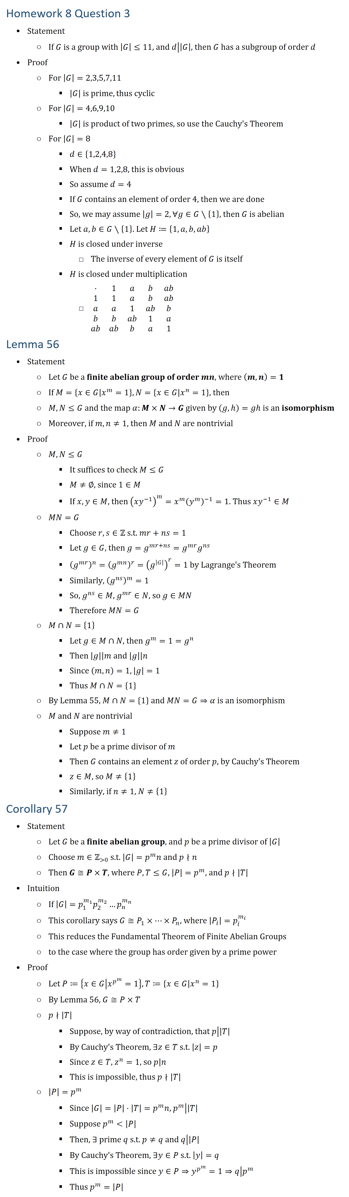 Homework 8 Question 3 • Statement ○ If G is a group with |G|≤11, and ├ d┤ ||G|┤, then G has a subgroup of order d • Proof ○ For |G|=2,3,5,7,11 § |G| is prime, thus cyclic ○ For |G|=4,6,9,10 § |G| is product of two primes, so use the Cauchy s Theorem ○ For |G|=8 § d∈{1,2,4,8} § When d=1,2,8, this is obvious § So assume d=4 § If G contains an element of order 4, then we are done § So, we may assume |g|=2,∀g∈G∖{1}, then G is abelian § Let a,b∈G∖{1}. Let H≔{1,a,b,ab} § H is closed under inverse □ The inverse of every element of G is itself § H is closed under multiplication □ ■8(⋅&1&a&b&ab@1&1&a&b&ab@a&a&1&ab&b@b&b&ab&1&a@ab&ab&b&a&1) Lemma 56 • Statement ○ Let G be a finite abelian group of order mn, where (m,n)=1 ○ If M={x∈G│x^m=1}, N={x∈G│x^n=1}, then ○ M,N≤G and the map α:M×N→G given by (g,h=gh is an isomorphism ○ Moreover, if m,n≠1, then M and N are nontrivial • Proof ○ M,N≤G § It suffices to check M≤G § M≠∅, since 1∈M § If x,y∈M, then (xy^(−1) )m=xm (y^m )^(−1)=1. Thus xy^(−1)∈M ○ MN=G § Choose r,s∈Z s.t. mr+ns=1 § Let g∈G, then g=g(mr+ns)=gmr g^ns § (g^mr )n=(gmn )r=(g|G| )^r=1 by Lagrange s Theorem § Similarly, (g^ns )^m=1 § So, g^ns∈M, g^mr∈N, so g∈MN § Therefore MN=G ○ M∩N={1} § Let g∈M∩N, then gm=1=gn § Then ├ |g|┤ |m┤ and ├ |g|┤ |n┤ § Since (m,n)=1,|g|=1 § Thus M∩N={1} ○ By Lemma 55, M∩N={1} and MN=G⇒α is an isomorphism ○ M and N are nontrivial § Suppose m≠1 § Let p be a prime divisor of m § Then G contains an element z of order p, by Cauchy s Theorem § z∈M, so M≠{1} § Similarly, if n≠1, N≠{1} Corollary 57 • Statement ○ Let G be a finite abelian group, and p be a prime divisor of |G| ○ Choose m∈Z( 0) s.t. |G|=p^m n and p∤n ○ Then G≅P×T, where P,T≤G, |P|=p^m, and p∤|T| • Intuition ○ If |G|=p_1^(m_1 ) p_2^(m_2 )…p_n^(m_n ) ○ This corollary says G≅P_1×…×P_n, where |P_i |=p_i^(m_i ) ○ This reduces the Fundamental Theorem of Finite Abelian Groups ○ to the case where the group has order given by a prime power • Proof ○ Let P≔{x∈G│x(pm )=1}, T≔{x∈G│x^n=1} ○ By Lemma 56, G≅P×T ○ p∤|T| § Suppose, by way of contradiction, that ├ p┤ ||T|┤ § By Cauchy s Theorem, ∃z∈T s.t. |z|=p § Since z∈T, z^n=1, so ├ p┤ |n┤ § This is impossible, thus p∤|T| ○ |P|=p^m § Since |G|=|P|⋅|T|=p^m n, ├ p^m ┤ ||T|┤ § Suppose p^m |P| § Then, ∃ prime q s.t. p≠q and ├ q┤ ||P|┤ § By Cauchy s Theorem, ∃y∈P s.t. |y|=q § This is impossible since y∈P⇒y(pm )=1⇒├ q┤ |p^m ┤ § Thus p^m=|P|